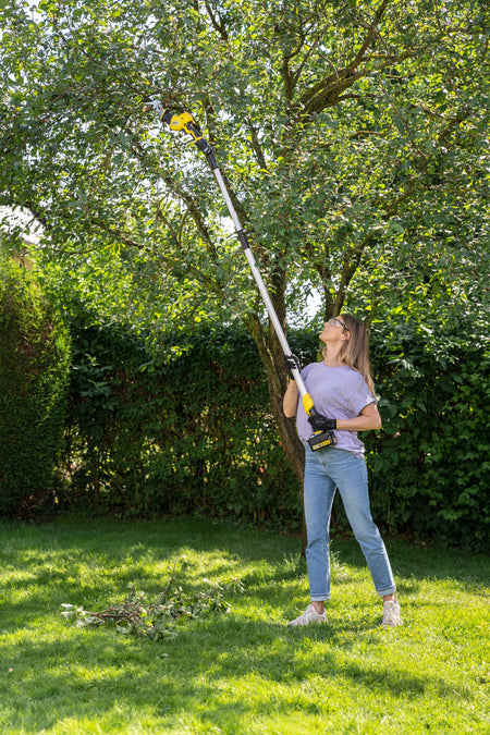 Die Kärcher 18 V Akku-Astsäge PGS 4-18 ist ein nützliches Tool bei der Baum- und Strauchpflege und bietet genug Power, um kleinere Holsägearbeiten im Garten schnell und mühelos zu erledigen. Die Astsäge verfügt über ein Sägeblatt Made in Germany. Es sorgt für einen präzisen Schnitt und sägt Zweige, Äste und sogar Sperr- und Kantholz bis zu einer Dicke von 8 cm ohne Probleme. Für einen besseren Halt, beispielsweise bei Arbeiten in der Höhe, kann der mtgelieferte Astbügel angebracht werden. Dieser hilft dabei, das Sägeblatt genau an der gewünschten Stelle zu fixieren und sorgt dafür, dass es nicht verrutscht. Mit dem Astbügel lässt sich Holz mit einem Durchmesser von 5 cm zuverlässig. sägen. Für Baumpflegearbeiten in einer Höhe von bis zu 3,50 m lässt sich eine Teleskopverlängerung nutzen, die als separates Zubehör erhältlich ist. Ist das Sägeblatt verschlissen, kann es mühelos und ohne Werkzeug aus der Klingenhalterung entnommen und durch ein neues ersetzt werden. Für eine komfortable Handhabung ist der Griff mit einem Soft-Material ausgestattet, wodurch die Akku-Säge sehr gut in der Hand liegt. Ein Sicherheitsschalter verhindert ein versehentliches Starten des Geräts. Mit einer Ladung des optional erhältlichen Kärcher 18 V/2,5 Ah Akkus lassen sich bis zu 120 Schnitte durchführen. Der Akkufuß lässt sich nach Bedarf entnehmen und an die Teleskopverlängerung anbringen, wodurch das Gewicht besser verteilt und eine bessere Kontrolle möglich ist. Im Lieferumfang befindet sich die Kärcher 18 V Akku-Astsäge PGS 4-18, ein Sägeblatt, ein Astbügel. Der Kärcher 18 V/2,5 Ah Akku und die Teleskopverlängerung sind separat erhältlich.