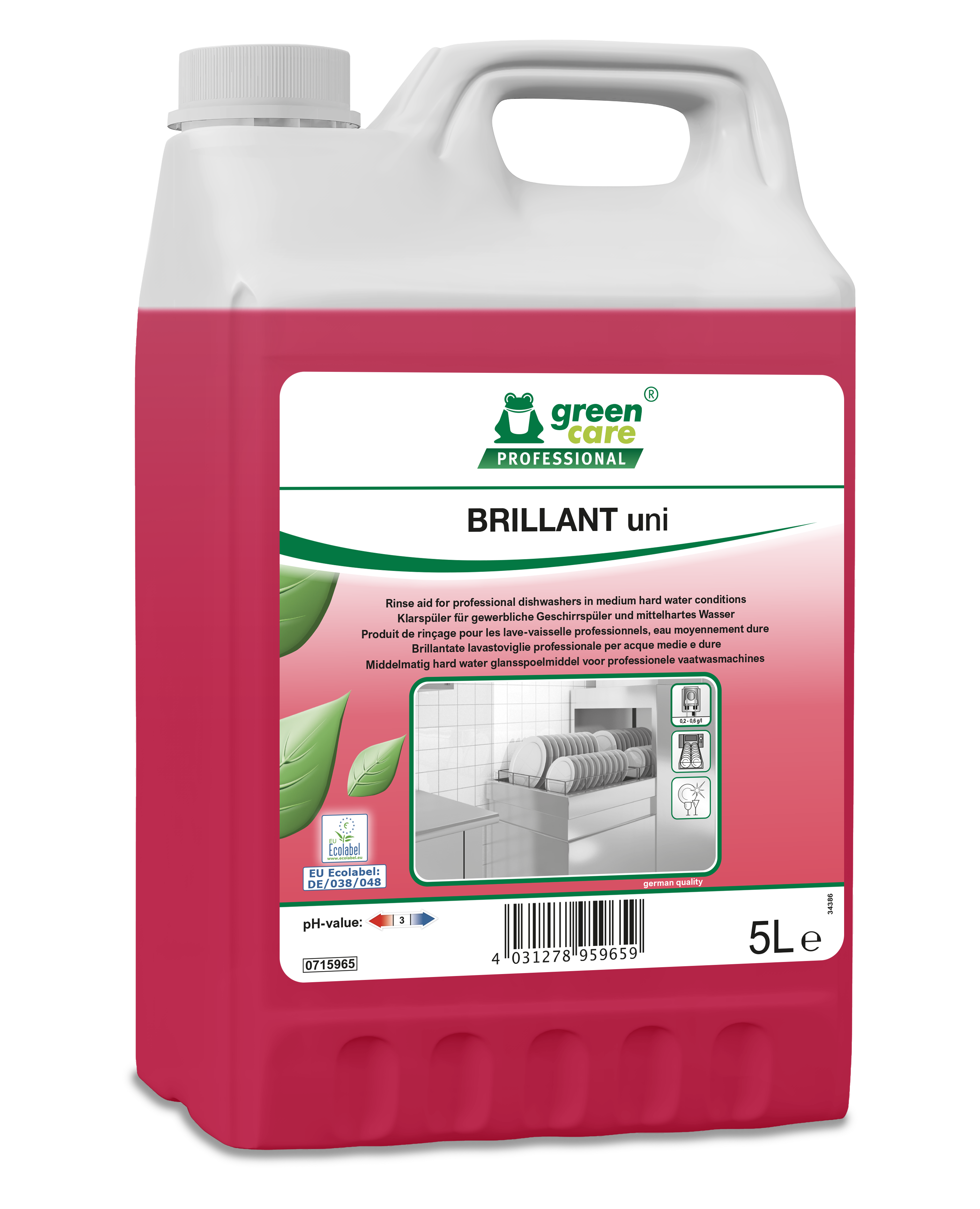 - BRILLANT uni bietet hervorragende Ergebnisse in weichem und mittelhartem Wasser und sogar unter schwierigen Bedingungen und verleiht Gläsern, Besteck und Geschirr einen hohen Glanz.