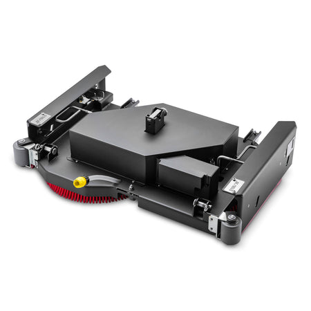 Der Bürstenkopf mit 2 Scheibenbürsten punktet mit praktischen und sinnvollen Details. So ist er mit einem zeitsparenden Bürsten-Schnellwechselsystem ausgestattet und verfügt dazu über Seitenschürzen, die sich automatisch an den Untergrund anpassen, das Wasser auf diesem Weg unter dem Bürstenkopf halten und damit selbst bei Kurvenfahrten für eine optimale Zuleitung der Reinigungsflotte zum Saugbalken sorgen. Die 100 Zentimeter große Arbeitsbreite ermöglicht obendrein große Flächenleistungen in kurzer Zeit.