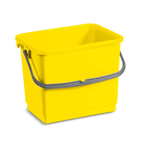 Gelber 4-Liter-Eimer mit farbcodiertem Reinigungssystem. Der Füllstand kann an Markierungen abgelesen werden. Anwendbar für alle Reinigungswagen.