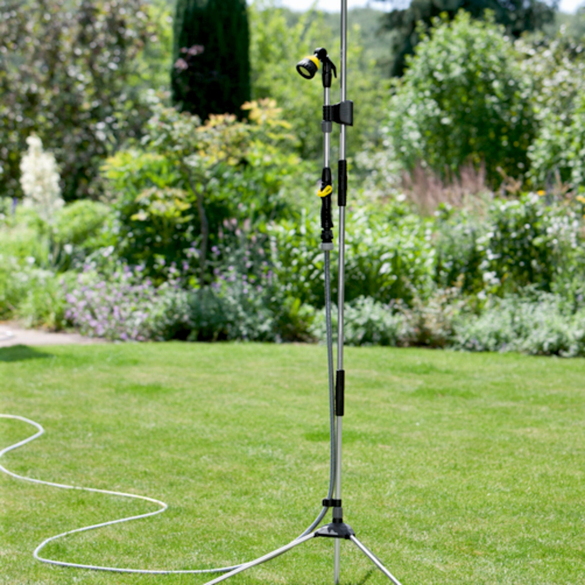 Die 2-in-1-Gartenlösung! Zum einen sorgt die binnen 3 Minuten aufgebaute, sehr stabile und höhenverstellbare Gartendusche (1,50 - 2,20 m) an heißen Sommertagen für ein prickelndes Duschvergnügen. Mit dem abnehmbaren Duschstab kann sich der Anwender wie bei einer Badezimmerdusche ganz normal abbrausen und erfrischen. Dank feinem Brausestrahl fällt der Wasserverbrauch dabei deutlich geringer aus als bei einer Abkühlung per Gartenschlauch. Zum anderen überzeugt der Duschstab aber auch in seiner Funktion als vollwertiger Gießstab zur effizienten Pflanzenbewässerung. Zur Wintersaison lässt sich die Dusche schnell und mühelos in ihre Einzelteile zerlegen, platzsparend ineinander stecken und kompakt verstauen. So ist sichergestellt, dass im nächsten Sommer auch nichts fehlt. Weitere Ausstattungsdetails: Dreibein und Spike für beste Stabilität, Einstufung der Wasserdurchflussmenge mit einer Hand, ON-/OFF-Funktion, beweglicher Sprühkopf (180°).