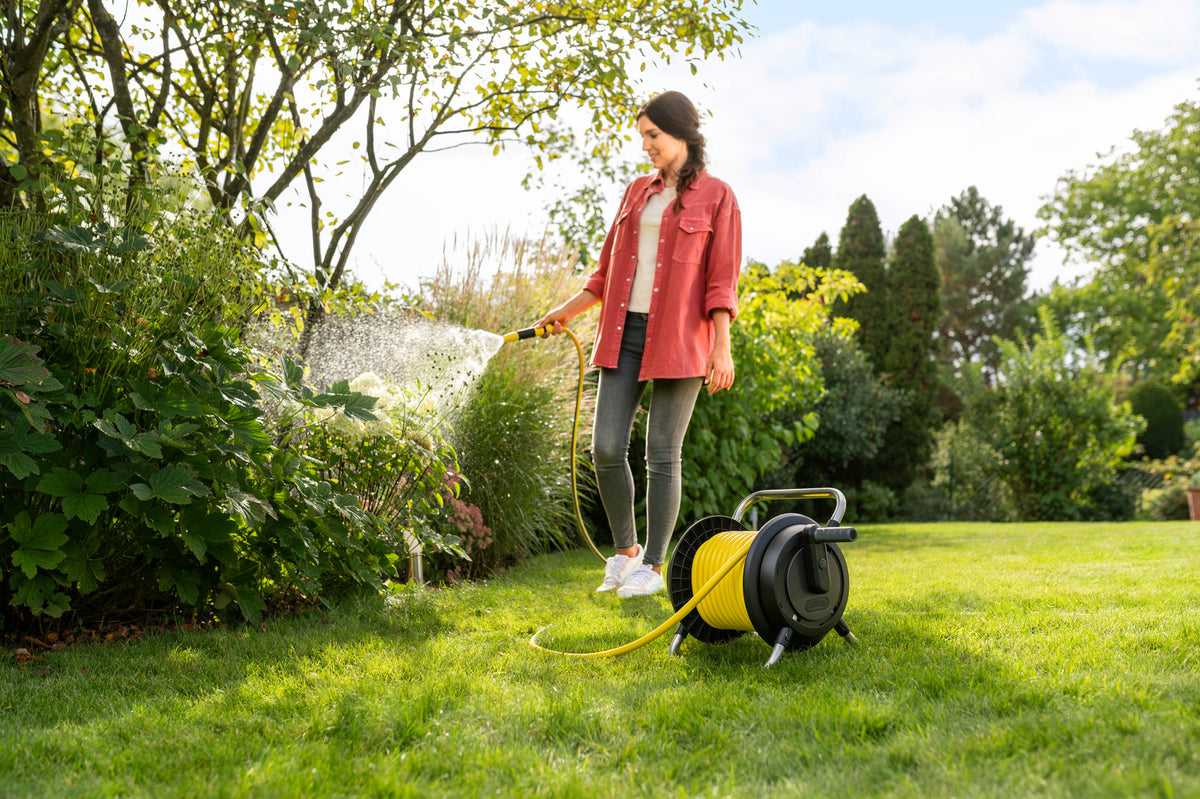 Mobiler Einsatz trifft auf kompakte Lagerung: Der Schlauchträger sorgt für eine komfortable Bewässerung und eine platzsparende Aufbewahrung des Gartenschlauchs. In dem Komplettset sind 10 Meter Gartenschlauch, Kupplungen, Hahnadapter und eine Gartenspritze enthalten. Mit Hilfe der freilaufenden Handkurbel lässt sich der Gartenschlauch mühelos aufrollen und kann ordentlich und schonend gelagert werden, ohne Knicke oder lästige Verwicklungen. Das Produkt punktet außerdem durch seine kompakte Bauweise, den ergonomischen Griff für einen bequemen Transport und die hohe Standfestigkeit durch einen tiefgelagerten Schwerpunkt. Zudem ist das Produkt UV- wie auch frostsicher. Kärcher Schlauchaufbewahrungen zeichnen sich durch eine hohe Robustheit und Langlebigkeit aus und haben 5 Jahre Herstellergarantie. Der Schlauchträger wird fertig montiert geliefert.