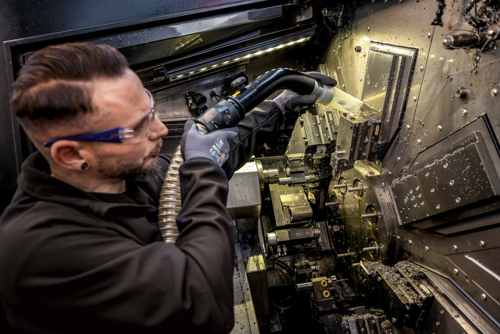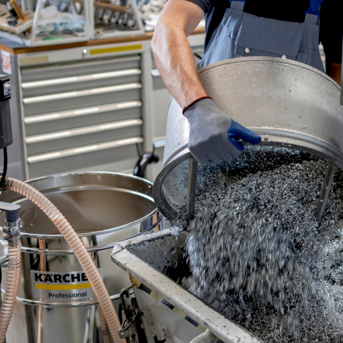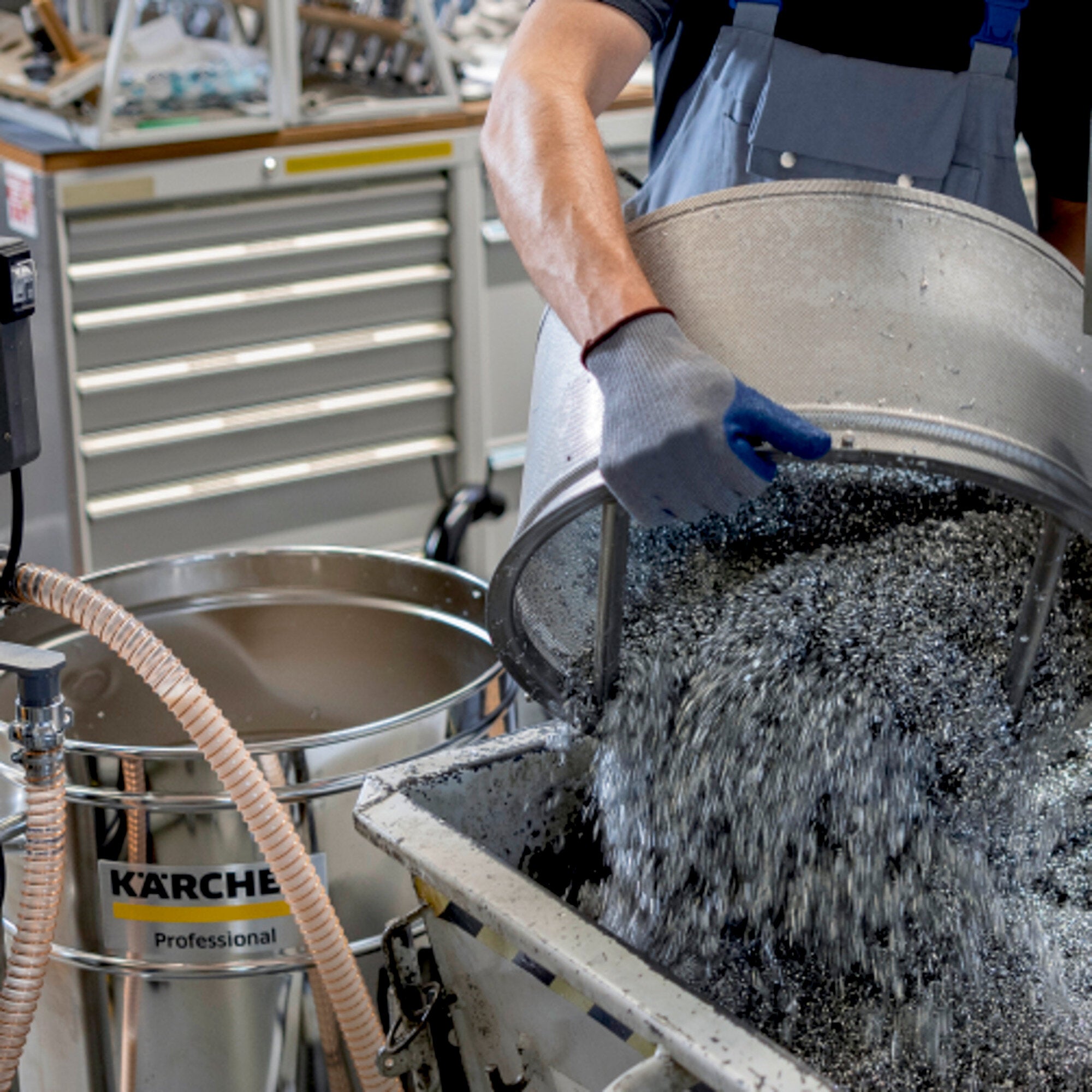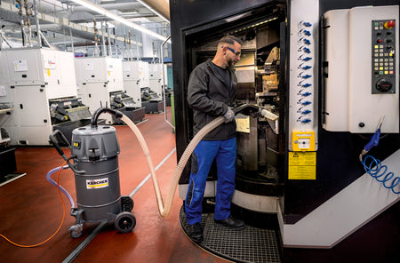 Ausgestattet mit 2 sehr leisen Gebläsemotoren für eine kraftvolle Saugleistung bei gleichzeitig geringem Betriebsgeräusch überzeugt das Industriesauger IVR-L 65/24-2 Set beim Saugen und Trennen von kleinen Mengen Flüssigkeiten und Feststoffen, wie Ölen, Kühlemulsionen oder groben, abrasiven Spänen. Damit ist der IVR-L 65/24-2 vielseitig einsetzbar, eignet sich jedoch insbesondere für Einsätze in der Metallindustrie. Die kompakte, platzsparende Bauweise und das robuste Fahrgestell ermöglichen darüber hinaus einen mühelosen Transport an unterschiedliche Einsatzorte. Serienmäßig im Lieferumfang enthalten sind eine Standarddüse, ein 3 Meter langer PU-Schlauch, ein Handgriff in DN 50 sowie ein 20-Liter-Siebkorb aus hochwertigem Edelstahl (V2A). Der Antriebskopf besteht zum Teil aus recyceltem Material.