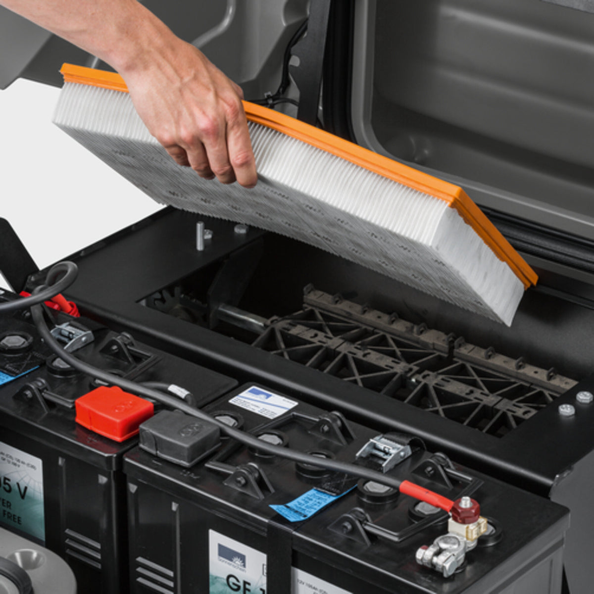 - Integriertes Home-Base-System und AblageflächenPraktische Anbindung zur unkomplizierten Mitnahme weiterer Reinigungsutensilien.Bequeme Mitnahme von zum Beispiel Grobschmutzzange, Besen, Lappen oder Behälter.Große Ablagefläche im Heck der Maschine.
