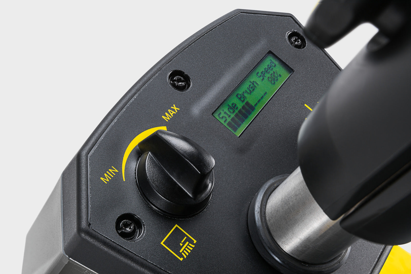 - Drehzahlregulierung des SeitenbesensZur Anpassung der Seitenbesendrehzahl an jeweilige Schmutzart und -menge.Reduziert eventuelle Staubaufwirbelungen.