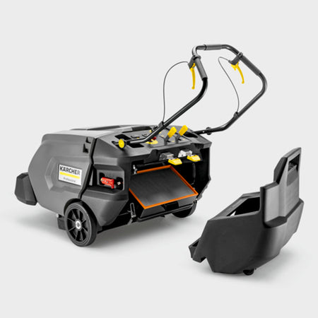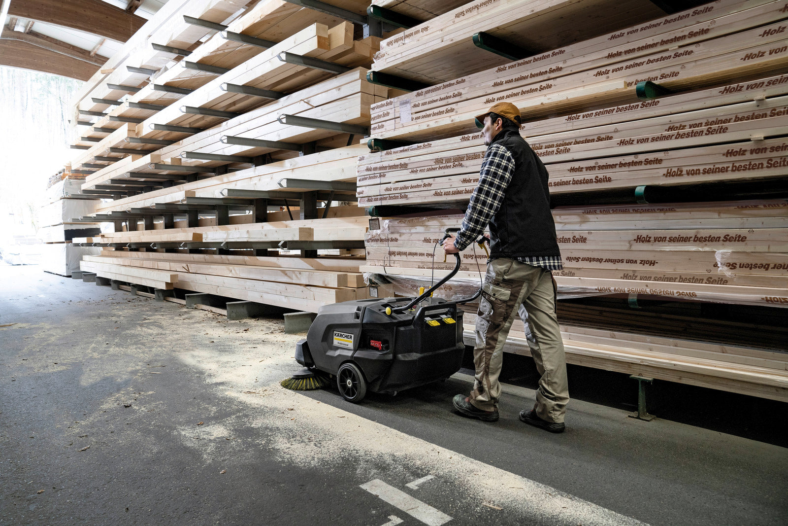 Die kompakt designte Industrie-Nachläufer-Kehrsaugmaschine KM 85/50 W Bp Pack überzeugt mit hervorragender Ausstattung ab Werk. So wird die Maschine beispielsweise serienmäßig mit Scheibenbremse, Batterie und zugehörigem Ladegerät geliefert. Der große Flachfaltenfilter mit höchst effektiver Abreinigung mittels Dual-Abstreifer erlaubt nahezu staubfreies Arbeiten, während die pendelnd gelagerte Kehrwalze auch bei ungünstigen Bodenverhältnissen und großen Schmutzmengen ausgezeichnete Reinigungsergebnisse ermöglicht. Überhaupt profitieren Anwender von dem sehr komfortablen und intuitiven Bedienkonzept mit Vorwärts- und Rückwärtsantrieb durch simples Drücken oder Ziehen des Schubbügels sowie sinnvollen Details wie der Kärcher Home-Base zur Mitnahme weiterer Reinigungsutensilien. Die robuste Maschine mit ausweichendem Seitenbesen und doppelwandigen Rahmen eignet sich hervorragend für harte Einsätze. Auch der einfache, werkzeuglose Wechsel von Hauptkehrwalze und Filter sowie die hohe Flächenleistung von bis zu 4725 m²/h (mit optionalen, linken Seitenbesen) erfüllen die hohen Anforderungen im industriellen Umfeld.
