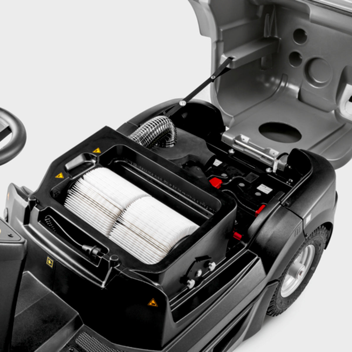 - Große Filterfläche mit automatischer AbreinigungNach jedem Abstellen der Maschine wird der Filter automatisch abgereinigt – für durchgängig staubarmes Kehren und lange Arbeitsintervalle.Filterabreinigung kann auch manuell aktiviert werden.Werkzeugloser Filterwechsel.