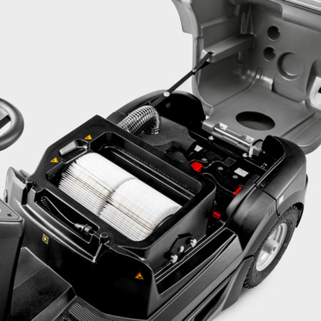 Unsere batteriebetriebene Aufsitz-Kehrsaugmaschine KM 90/60 R Bp Pack mit ausweichendem Seitenbesen begeistert mit ihrem agilen Fahrverhalten und hoher Wendigkeit bei emissionsfreien Reinigungseinsätzen in Innen- und Außenbereichen, wie in Parkhäusern, Logistikzentren oder Produktionshallen. Ausdauernde 180-Ah-Batterien, die komfortabel on-board geladen werden, gewährleisten dabei lange Arbeitseinsätze. Dazu ist die KM 90/60 R Bp Pack dank EASY-Operation-System kinderleicht zu bedienen und verfügt über eine praktische Pick-up-Fläche sowie den Anbausatz Home-Base, sodass auch die Mitnahme weiterer Reinigungsutensilien problemlos möglich ist. Das einzigartige, automatische und höchst effektive Rundfilter-Abreinigungssystem ermöglicht staubfreies Arbeiten ohne Saugkraftverluste.