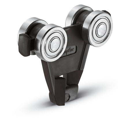 Leitungswagen für C-Schienenprofil. Die Tragfähigkeit beträgt 20 kg, das Gewicht 0,11 kg. Das Kugellager ist aus verzinktem Stahl.