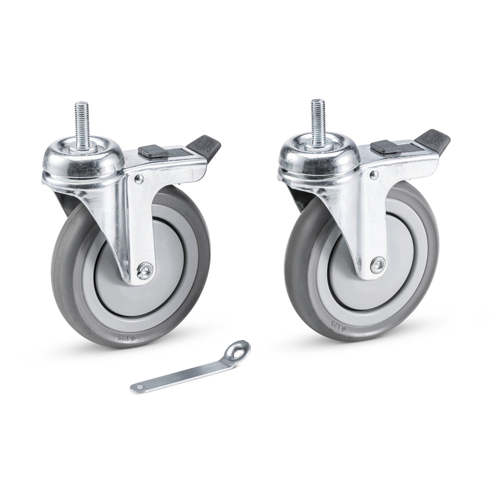 Die Lenkrollen mit Bremse Std. D125 kommen im 2er-Pack und sind standardmäßig in den Expert- und ExpertPro-Varianten des Trolleys verbaut. Sie sind sehr robust und sowohl auf Hartböden als auch Textilbelägen einsetzbar. Durch die Bremse kann der Trolley auch auf schrägen Untergründen sicher geparkt werden.