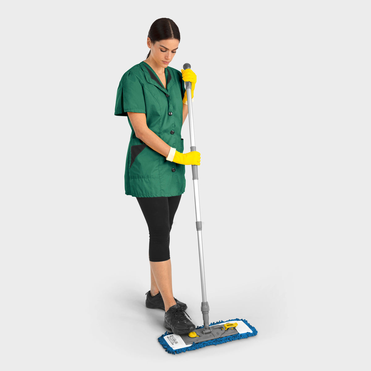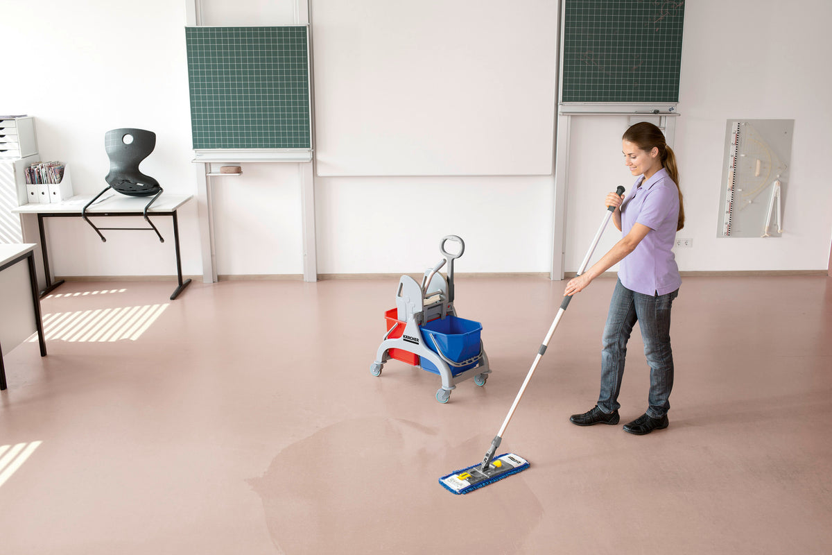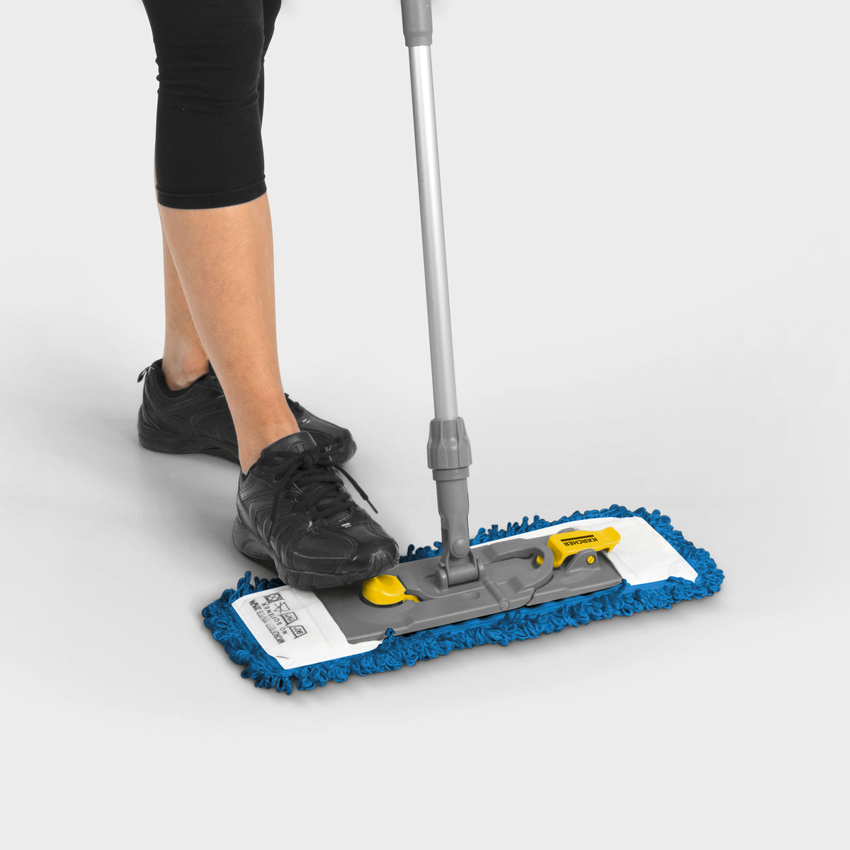 Das Moppsystem ECO! von Kärcher verfügt über eine Verschlussmöglichkeit am Kardangelenk sowie einen auf 184 Zentimeter ausziehbaren Teleskopstiel und eignet sich damit hervorragend auch für vertikale Reinigungsaufgaben. Das Moppset bietet dank Taschenfixierung darüber hinaus eine schnelle und einfache Wechselmöglichkeit der Mopps. Zusätzlich werden diese rückenschonend durch einen Clip fixiert – ständiges Bücken wird so vermieden.