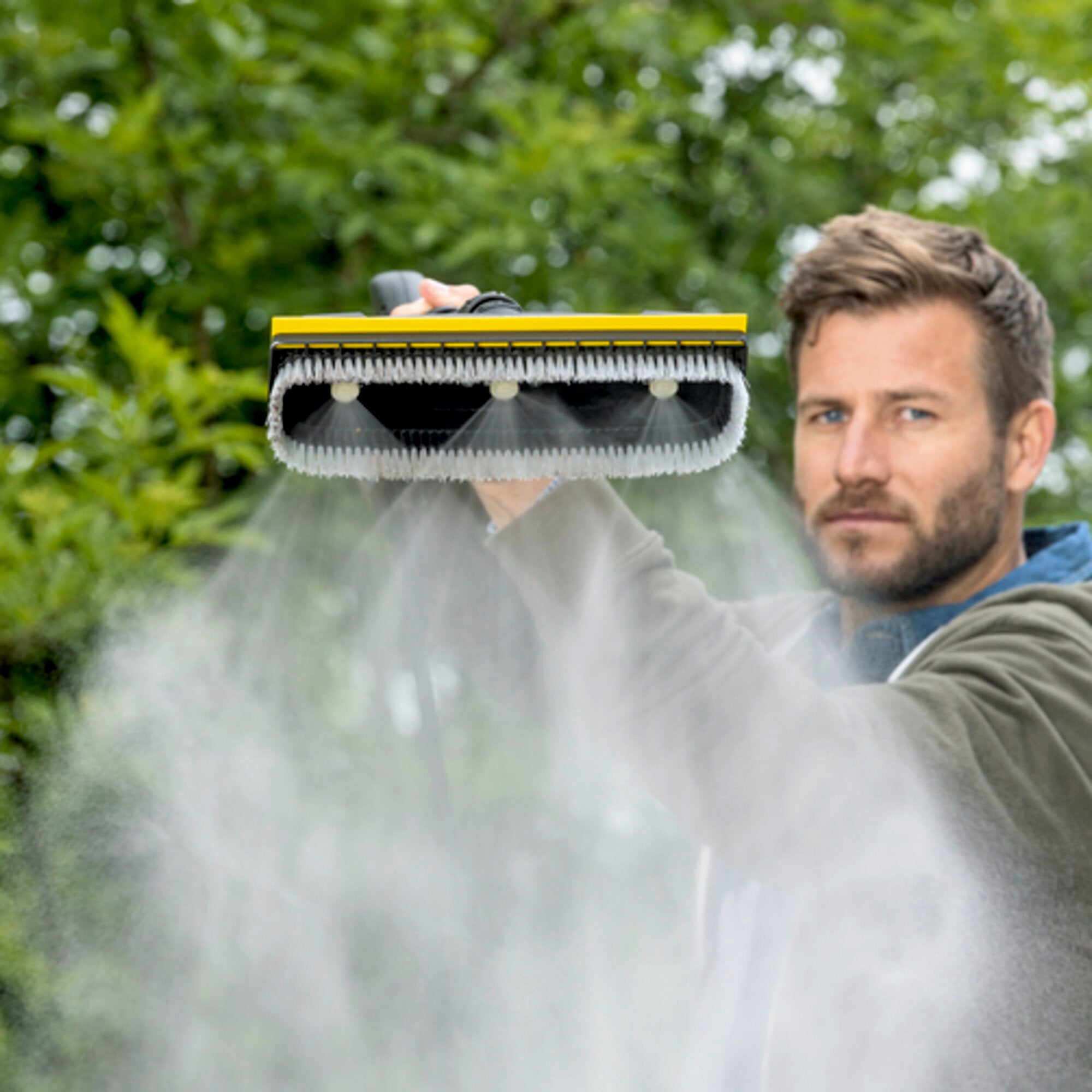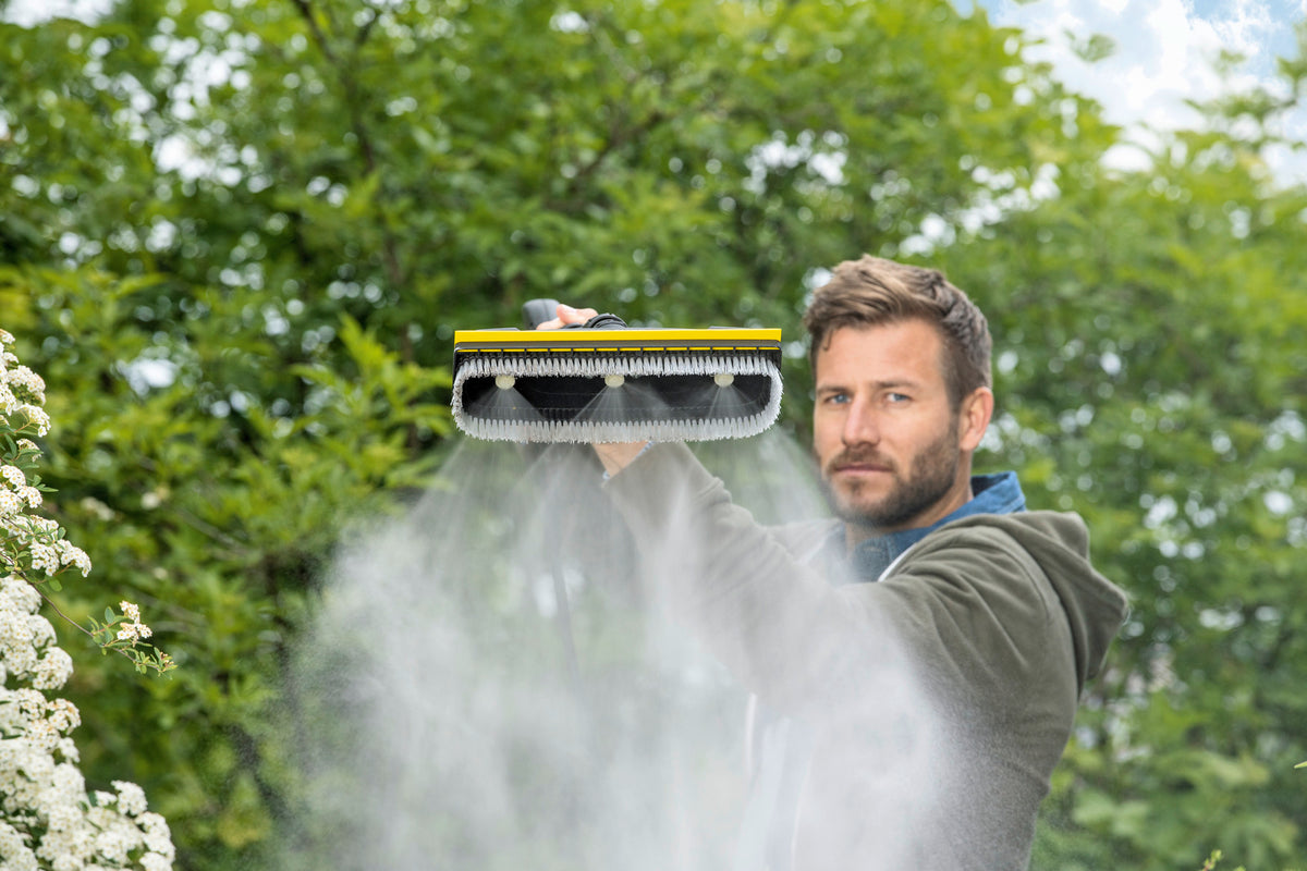 Der Powerschrubber PS 30 sorgt für strahlende Reinigungsergebnisse auf verschiedensten Oberflächen. Dafür sorgen 3 Hochdruckdüsen, die auch hartnäckigen Schmutz lösen. Damit ist der PS 30 der optimale Helfer für die zuverlässige Reinigung von kleinen bis mittelgroßen Flächen, wie für Treppen und Kanten. Um an schwer zugängliche Stellen zu gelangen, kann der Bürstenkopf um 360° gedreht werden. Alle glatten Flächen können nach der Reinigung mit der integrierten Schmutzlippe abgezogen werden. So wird überflüssiges Schmutzwasser schnell entfernt und die Flächen sind direkt wieder nutzbar. Diese Kombination aus Hochdruckstrahl und manuellem Bürstendruck stellt mit seiner Reinigungsleistung jeden herkömmlichen Schrubber in die Ecke und kann mit allen Kärcher Hochdruckreinigern der Klassen K 2 bis K 7 kombiniert werden.