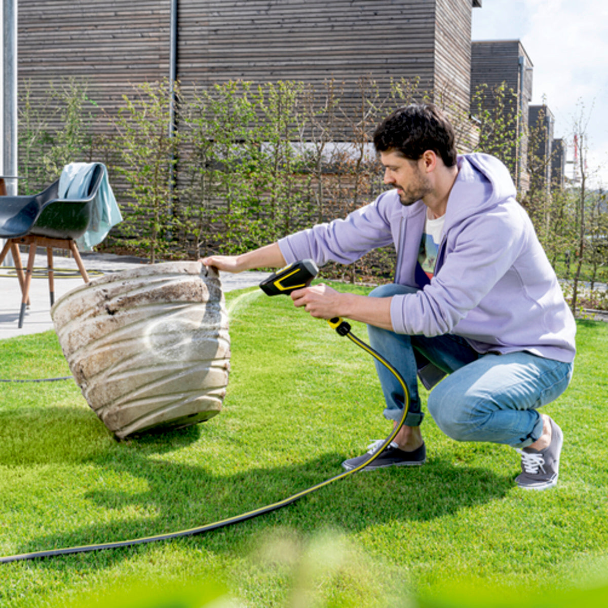 Die Reinigungspistole WBS 3 ist die ideale Ergänzung zu jedem Gartenschlauch. Einfach die WBS 3 mit dem Anschlussstück am Schlauch befestigen und schon kann es losgehen. Der innovative Rotationsstrahl entfernt schnell frische Verschmutzungen und ermöglicht eine mühelose Reinigung großer Flächen. Die erzielte Zeitersparnis beträgt bis zu 50 Prozent im Vergleich zu herkömmlichen Spritzpistolen. Darüber hinaus ist die Reinigung mit dem Bleistiftstrahl äußerst präzise, was durch die hochwertige Metalldüse optimiert wird. Das Gerät bietet einen schnellen und vielseitigen Einsatz für alle leicht verschmutzten Gartenobjekte. Die 2 x 1,5 V AA-Batterien für die Stromversorgung des Rotationsstrahls sind im Lieferumfang enthalten.