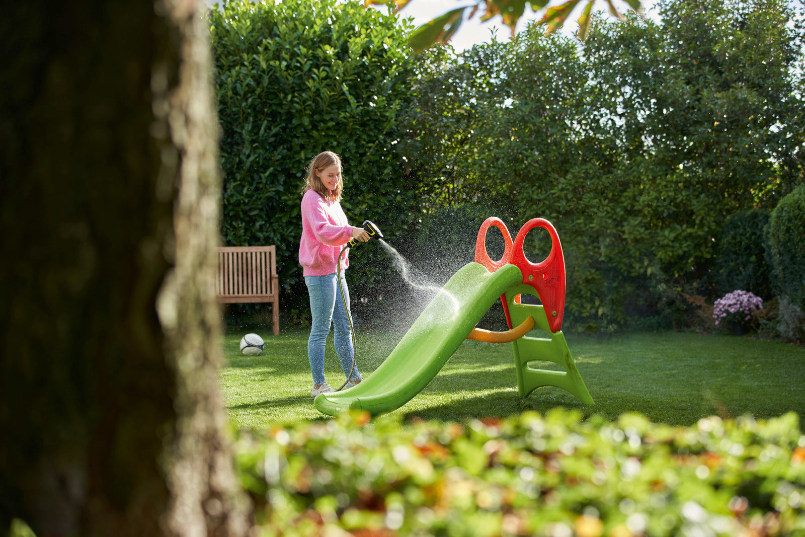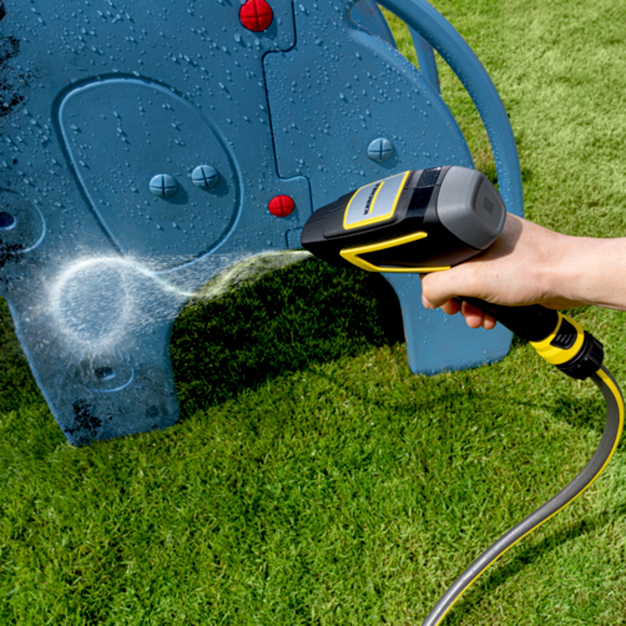 - Innovativer rotierender StrahlIm Vergleich zu einem herkömmlichen Gartenregner reduziert der Drehstrahl die Reinigungszeit umbis zu50 %.Bis zu einer Stunde Laufzeit des Drehstrahls mit den mitgelieferten AA-Batterien.