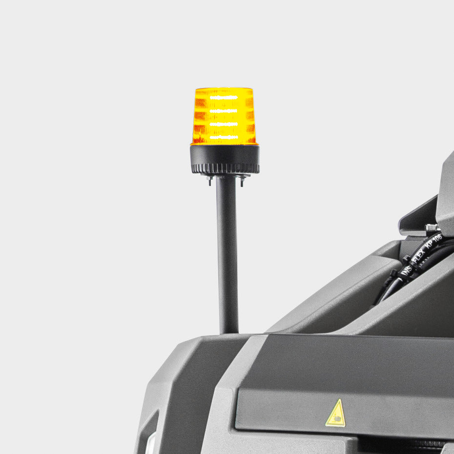 Weithin sehr gut sichtbare Rundumkennleuchte für die Aufsitzkehrmaschine KM 100/120 R von Kärcher zur Erhöhung der Arbeitssicherheit bei Reinigungseinsätzen im Innen- und Außenbereich.