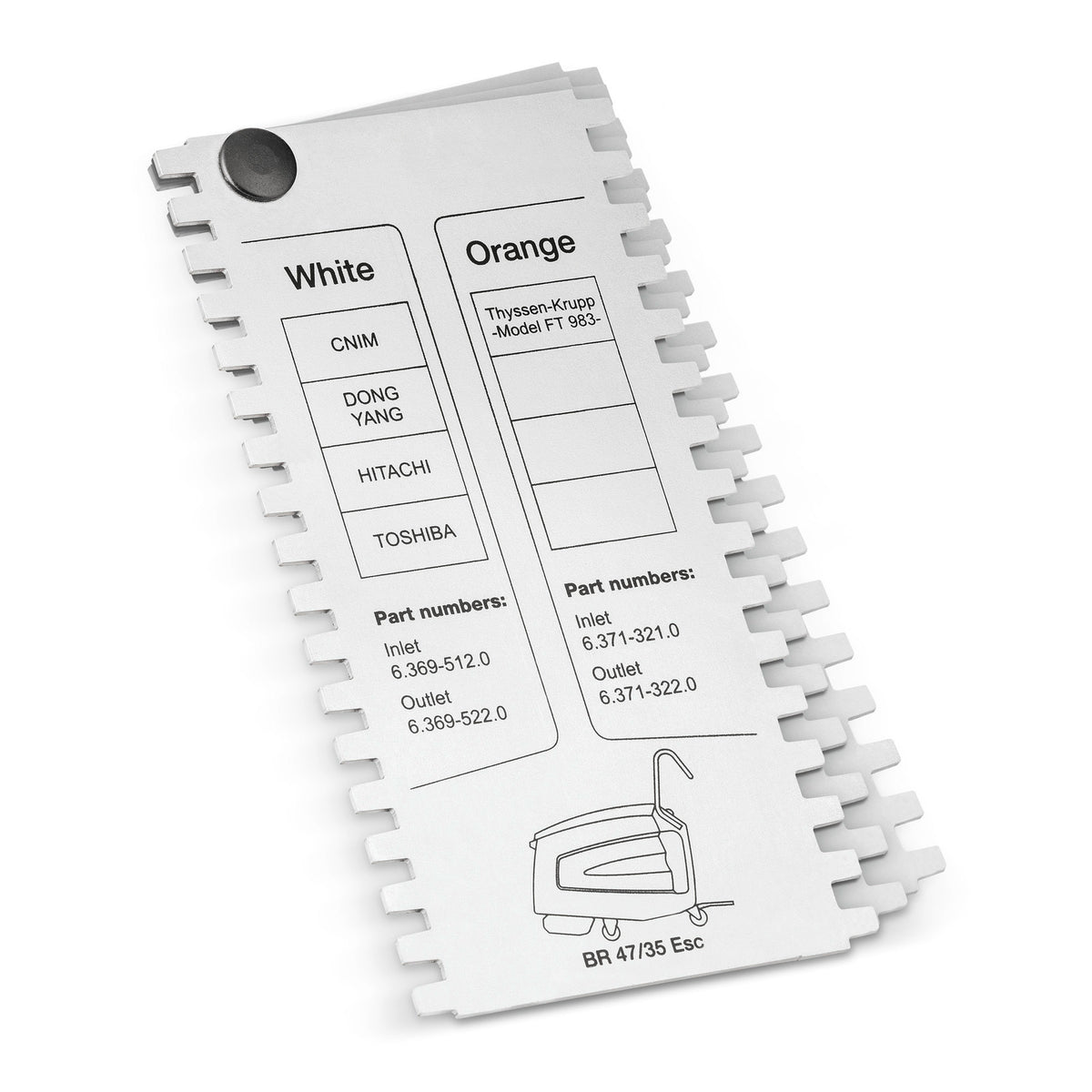 Zum einfachen Ablesen des Rolltreppenprofils entwickelte Schablone für den Rolltreppenreiniger BR 47/35 ESC von Kärcher. Die Schablone ermöglicht das einfache und schnelle Identifizieren der für die unterschiedlichen Rolltreppenhersteller jeweils passenden Ein- und Auslaufkämme – und damit die nahezu universelle Einsatzbereitschaft des Rolltreppenreinigers bei den unterschiedlichen Modellen der Hersteller.