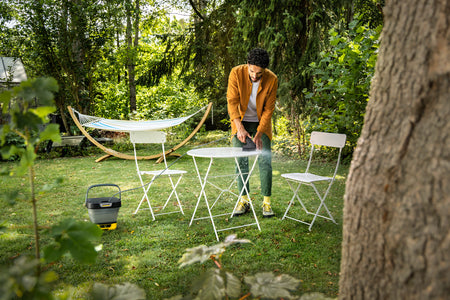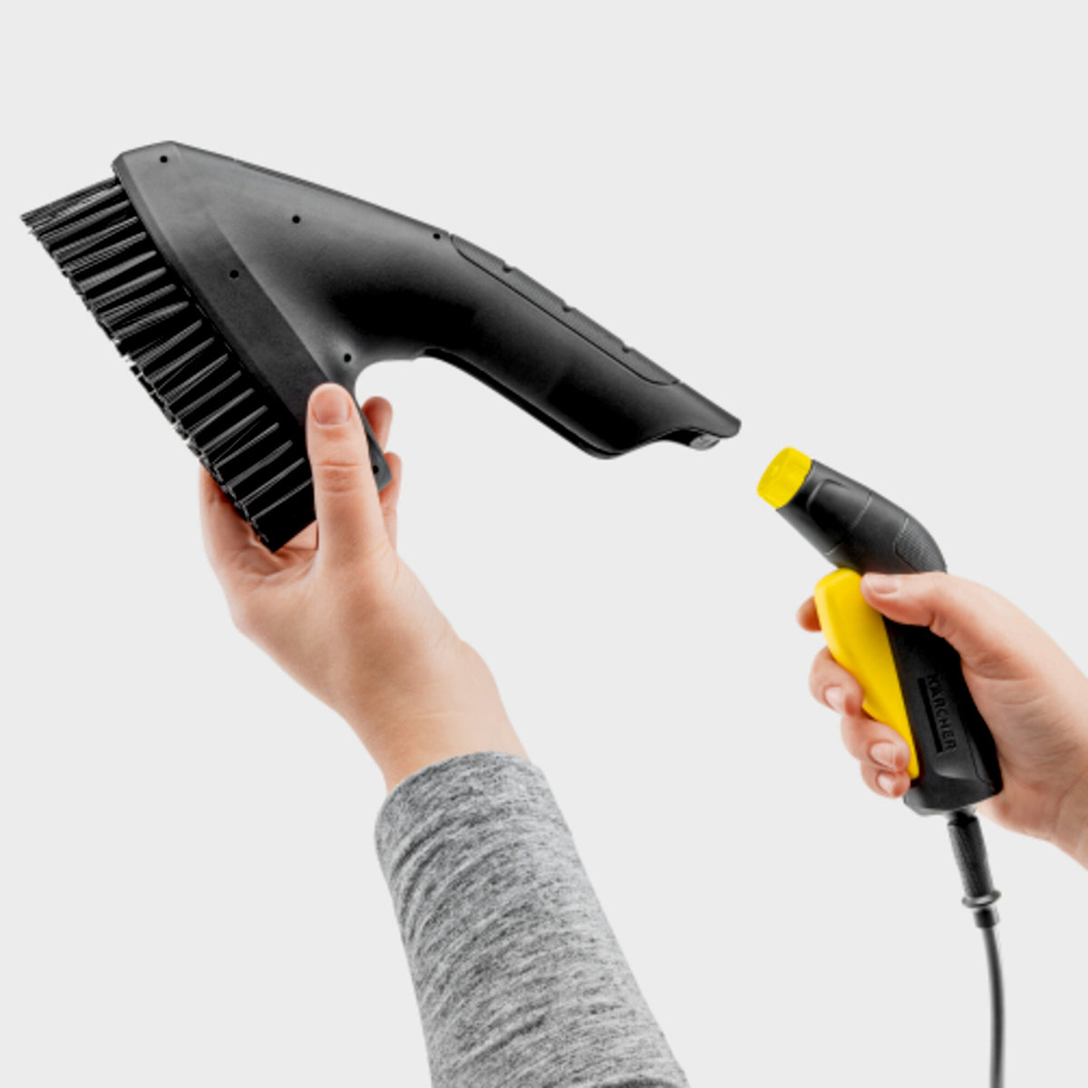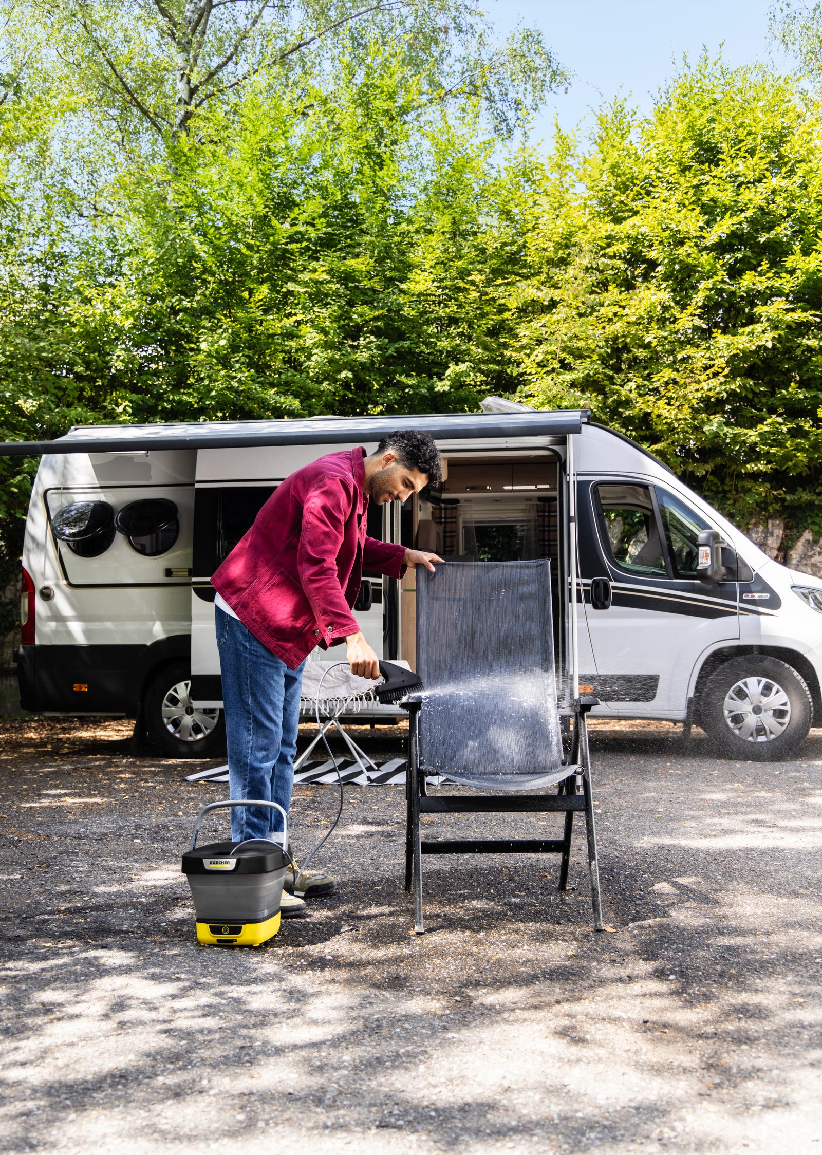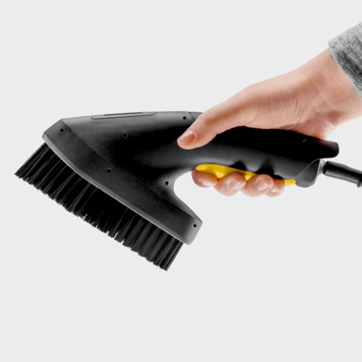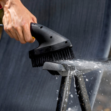 Die Schrubbbürste ist ideal geeignet, um hartnäckigen Schmutz wie zum Beispiel einen klebrigen Film aus Blütenpollen auf Gartenmöbeln oder verkrusteten Dreck schnell und gründlich zu lösen und wegzuschwemmen. Ihre Kombination aus Druckstrahl und Borsten sorgt auch bei der schnellen Reinigung zwischendurch für eine besonders kraftvolle Reinigungswirkung. Anwendungsgebiete können zum Beispiel Gartenmöbel, Fahrräder und anderes Outdoor-Equipment sein. Die Montage der Bürste erfolgt direkt an der Pistole. Mit ihrem Anti-Rutsch-Profil sowie der ergonomischen Form liegt die Bürste angenehm und griffig in der Hand für sicheres und ermüdungsfreies Arbeiten. Da Wasser nur dann zum Einsatz kommt, wenn der Abzug am Gerät betätigt wird, kann der Wasserverbrauch sehr effizient und individuell gesteuert werden. Auf diese Weise wird zugleich der Akku geschont. Die Schrubbbürste ist mit allen Mobile Outdoor Cleanern OC 3 kompatibel.