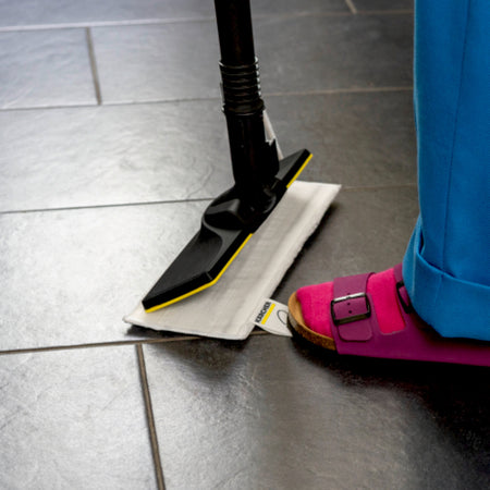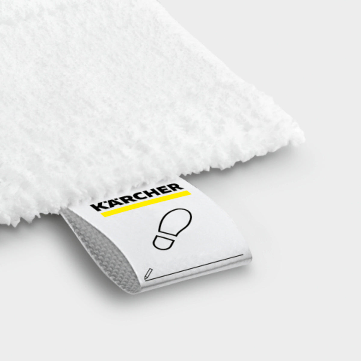 Das Sensitiv Bodentuchset enthält 2 Tücher aus besonders weichen Fasern, die weniger Feuchtigkeit und Hitze an den Boden weitergeben. So lassen sich auch empfindliche, versiegelte Böden sehr schonend dampfreinigen. Dank des Klettsystems lassen sich die Tücher leicht und schnell an der Bodendüse EasyFix des Dampfreinigers fixieren: einfach das Bodentuch an die Bodendüse EasyFix andrücken und fertig. Während der Arbeit bleibt das Tuch sicher in seiner Position – auch Ecken und Kanten werden mühelos sauber. Nach der Arbeit kann das benutzte Tuch ohne Schmutzkontakt von der Bodendüse EasyFix entfernt werden: Dazu wird nur auf die am Tuch befestigte Fußlasche getreten und die Düse nach oben weggezogen.