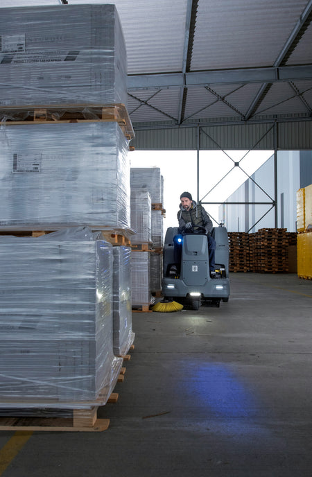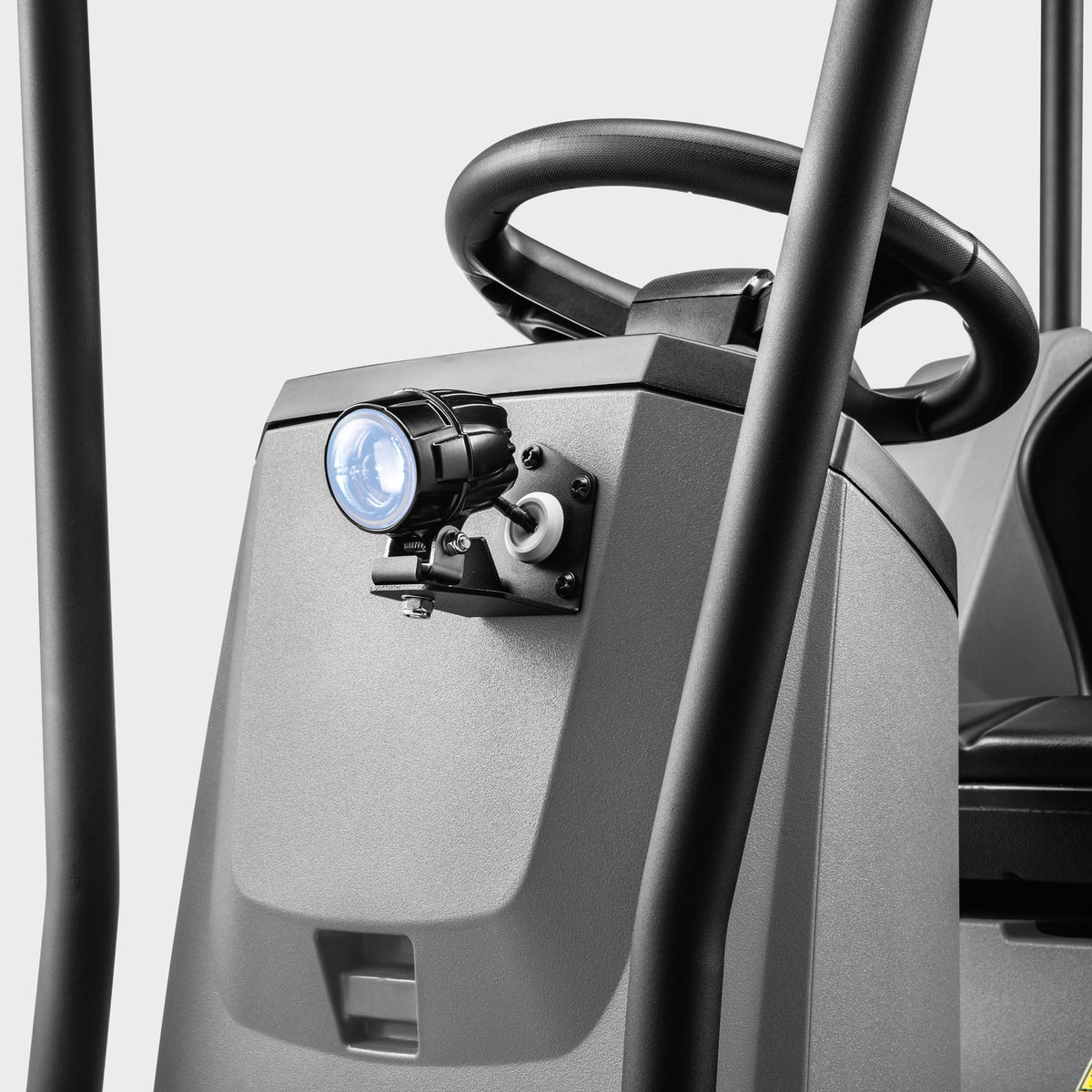 Insbesondere in hochfrequenten Bereichen und bei lauten Umgebungsgeräuschen sorgt das Spot-Licht blau für unsere Kehrsaugmaschine KM 100/120 R für bestmögliche Sichtbarkeit der Maschine. Die optische Fahrweg-Warneinrichtung projiziert einen blauen Lichtpunkt auf den Boden vor der Maschine, macht so Fußgänger und andere Fahrzeuge auf die kreuzende Kehrmaschine aufmerksam und trägt so direkt zu höchstmöglicher Sicherheit für Mensch und Maschine bei.