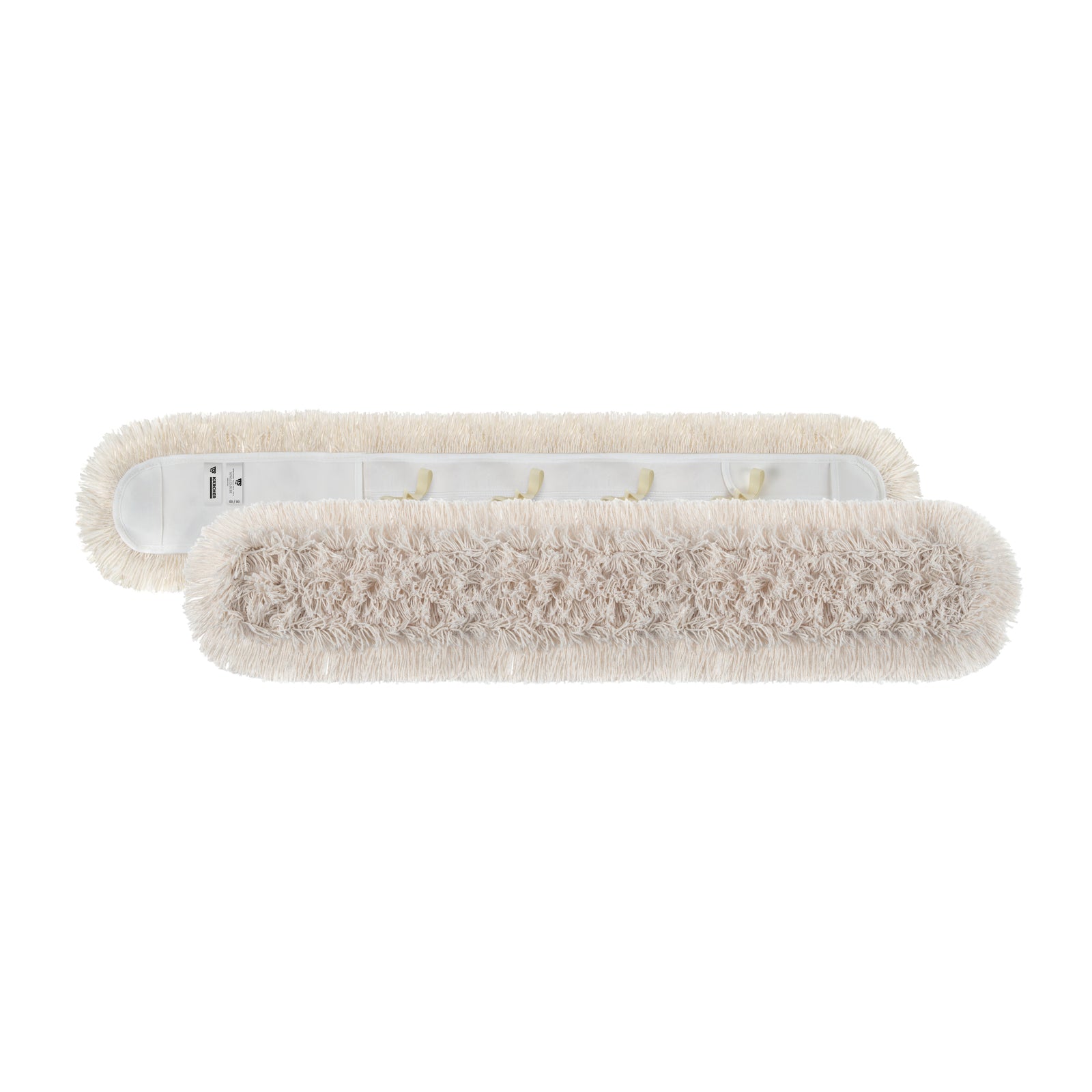 Dank offener Außenfransen, die speziell an Rändern oder rund um Stuhl- und Tischbeine eine sehr gute Grobschmutzaufnahme und Staubbindung ermöglichen, eignet sich der waschbare, 120 Zentimeter breite Staubmopp aus 100 Prozent Baumwolle von Kärcher insbesondere zur Trockenreinigung von glatten Flächen in stark überstellten Bereichen wie in Schul- und Besprechungszimmern, in Turnhallen oder in Einkaufszentren. Auch die kurzen, offenen Fransen im zentralen Reinigungsbereich verfügen über ein hervorragendes Staubrückhaltevermögen – eine Eigenschaft, die sich durch den Einsatz eines staubbindenden Produkts noch weiter verbessern lässt. Der Staubmopp Baumwolle mit 120 Zentimeter Breite ist zur Verwendung mit dem Staubmopphalter 120 cm vorgesehen.