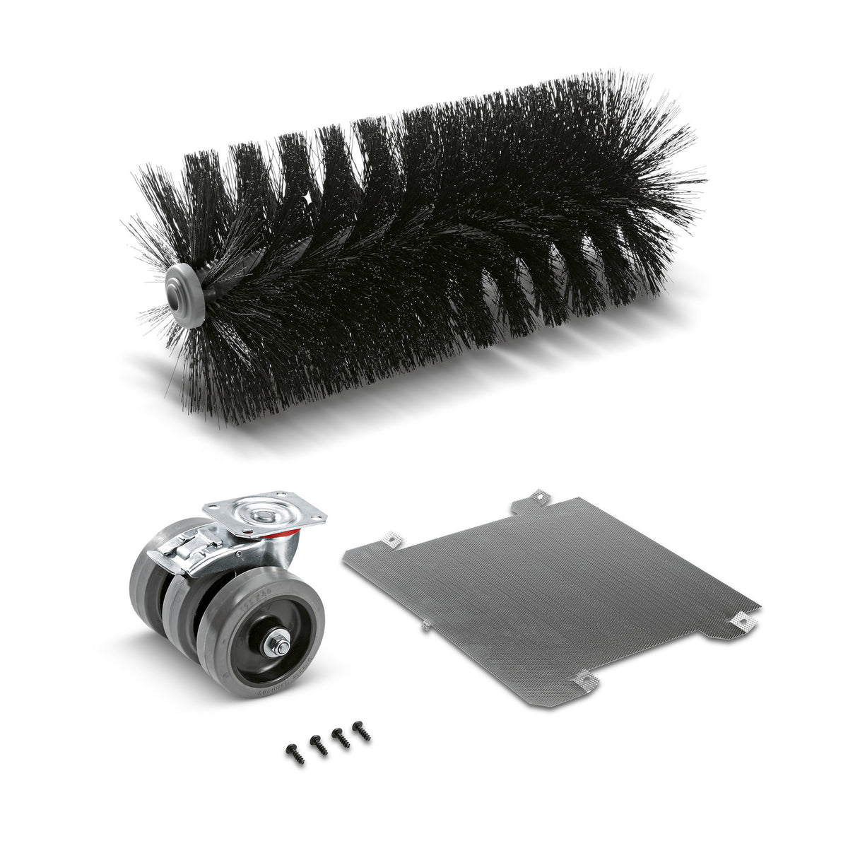 Teppichkehrset inkl. Flusensieb, 3-fach-Lenkrolle und Antistatik-Kehrwalze zur Reinigung von Teppichflächen.
