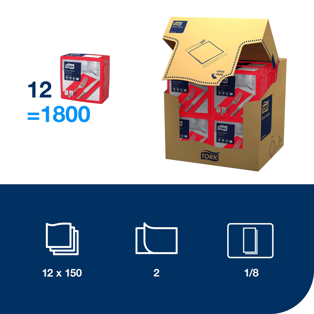 Bringen Sie eine elegante Note in Ihr Restaurant und punkten Sie bei Ihren Gästen mit diesen praktischen Tork Dinnerservietten. Da sie größer sind als Standard-Papierservietten, bieten sie mehr Komfort beim Essen. Auch Ihr Personal wird sich freuen, denn mit diesen vorgefalteten Servietten sparen sie Zeit für das Eindecken der Tische. Nach Gebrauch lassen sich die Einwegservietten einfach entsorgen – so sparen Sie auch Wäschereikosten. Die Servietten sind in modernen und klassischen Farbtönen erhältlich, sodass sie sich problemlos dem Ambiente anpassen.