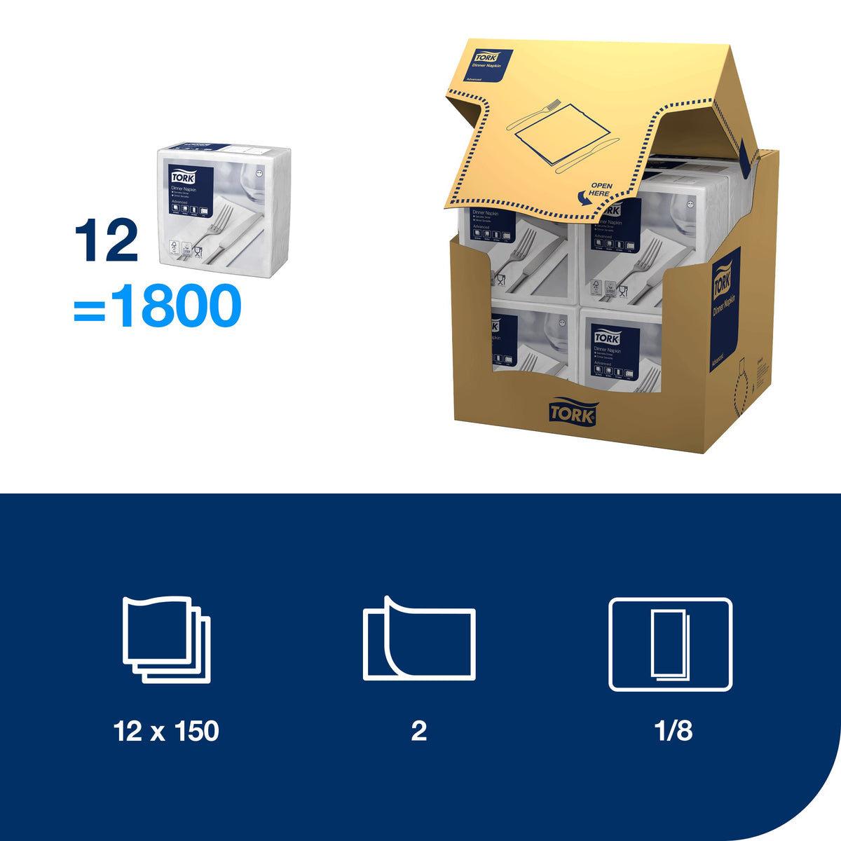 Bringen Sie eine elegante Note in Ihr Restaurant und punkten Sie bei Ihren Gästen mit diesen praktischen Tork Dinnerservietten. Da sie größer sind als Standard-Papierservietten, bieten sie mehr Komfort beim Essen. Auch Ihr Personal wird sich freuen, denn mit diesen vorgefalteten Servietten sparen sie Zeit für das Eindecken der Tische. Nach Gebrauch lassen sich die Einwegservietten einfach entsorgen – so sparen Sie auch Wäschereikosten. Die Servietten sind in modernen und klassischen Farbtönen erhältlich, sodass sie sich problemlos dem Ambiente anpassen.