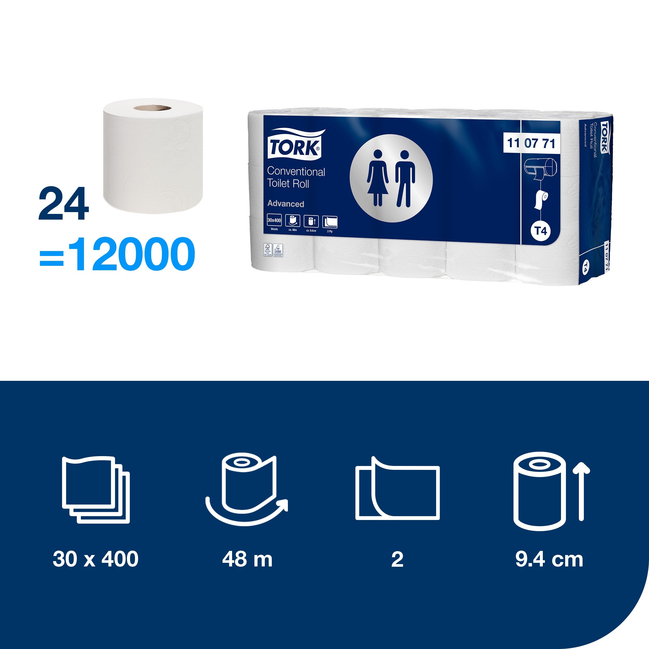 Bieten Sie Gästen den von zu Hause gewohnten Komfort in wenig frequentierten Waschräumen dank unseres Tork Kleinrollen Toilettenpapiers. Dieses Klopapier in der Großpackung hinterlässt einen guten Eindruck aufgrund des ansprechenden Designs und der 2-lagigen Konstruktion. Auch das Preis-Leistungs-Verhältnis ist optimal, sodass Sie Kosten sparen, ohne auf Qualität zu verzichten. Der kompatible Tork T4 Toilettenpapierspender ist dank Abriss-Funktion besonders benutzerfreundlich. Zudem enthält er zwei Rollen – für weniger Wartungsaufwand. Die Verpackung ist aus mindestens 30 % Post-Consumer-Recycling-Kunststoffen (PCR-Kunststoffen) hergestellt.
