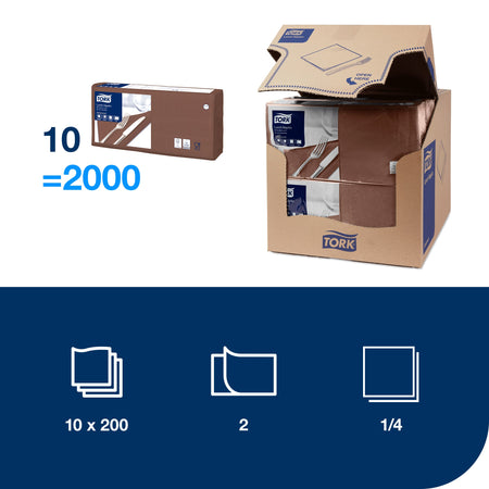 Erfüllen Sie Ihre Ansprüche, ohne das Budget zu überschreiten, mit unseren 2-lagigen Tork Lunchservietten. Das praktische Lunch-Formt ist ideal für Gaststätten, die kleine Mahlzeiten und Snacks servieren. Das dickere Design dieser Restaurant-Servietten ist saugfähig genug, um schnell und einfach verschüttete Speisen und Getränke aufzuwischen. Dank unserer großen Palette an modernen und klassischen Farben können Sie genau die Servietten aussuchen, die am besten zu Ihrer Einrichtung im Restaurant passen.