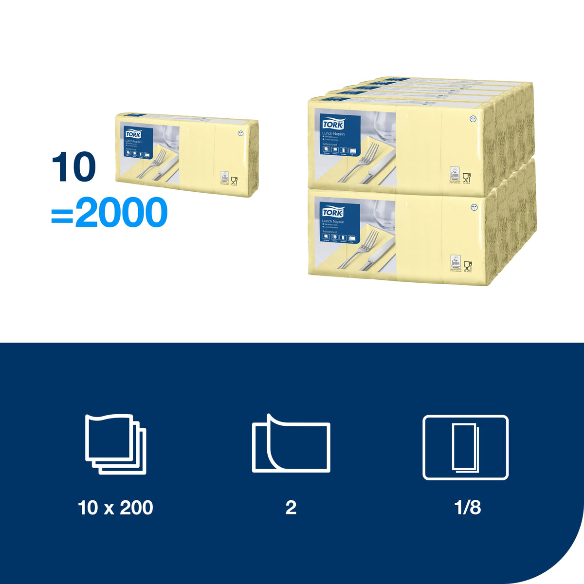 Sparen Sie wertvolle Zeit mit unseren vorgefalteten Tork Lunchservietten, wenn Sie kleine Mahlzeiten oder einen Snack servieren. Sie profitieren dank des praktischen Lunch-Formats von einem hervorragenden Preis-Leistungs-Verhältnis und das 2-lagige Design sorgt dafür, dass verschüttete Speisen und Getränke schnell aufgewischt werden können. Suchen Sie die Papierservietten passend zu Ihrer Einrichtung aus: Wir bieten eine große Palette an modernen und klassischen Farbtönen zur Auswahl.