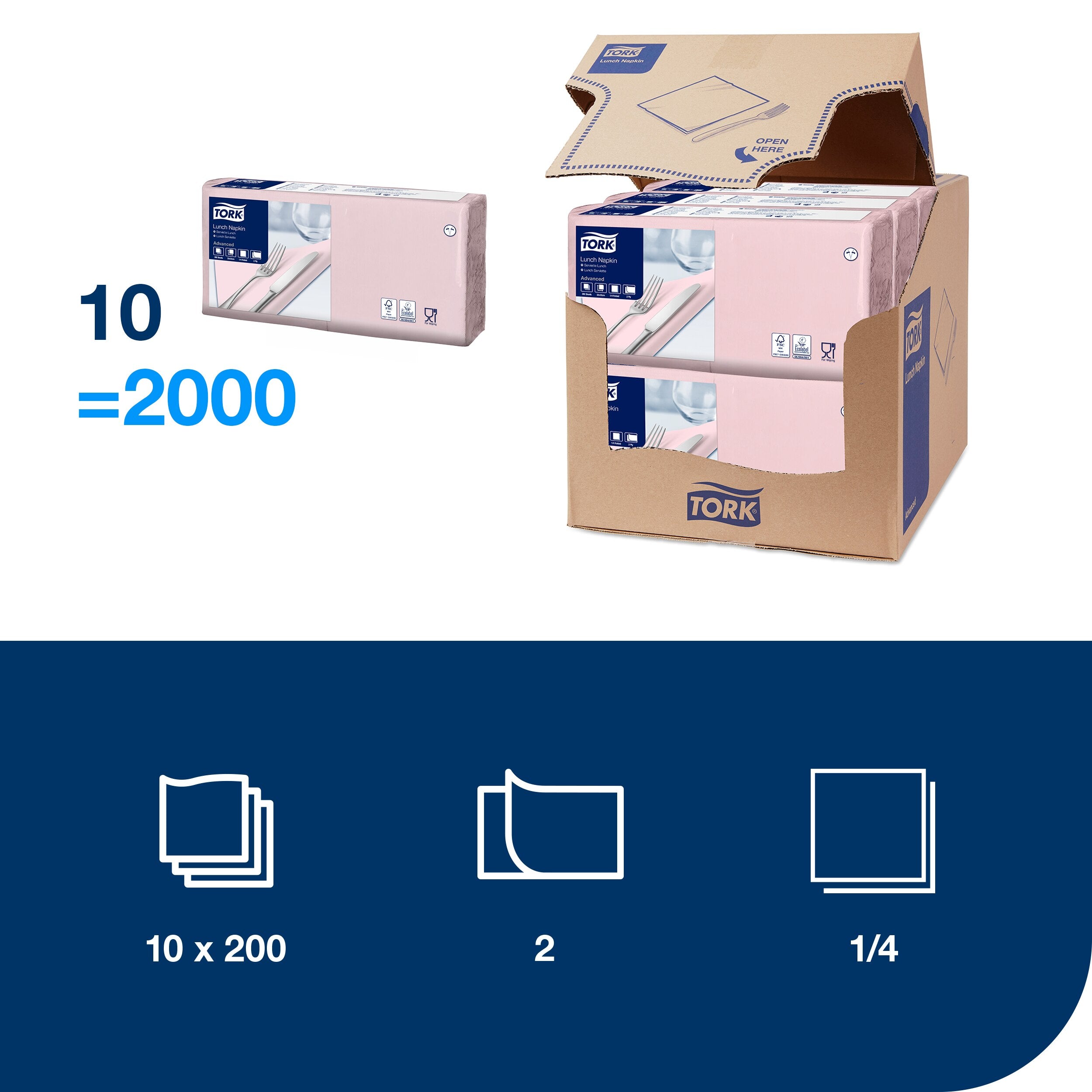 Erfüllen Sie Ihre Ansprüche, ohne das Budget zu überschreiten, mit unseren 2-lagigen Tork Lunchservietten. Das praktische Lunch-Formt ist ideal für Gaststätten, die kleine Mahlzeiten und Snacks servieren. Das dickere Design dieser Restaurant-Servietten ist saugfähig genug, um schnell und einfach verschüttete Speisen und Getränke aufzuwischen. Dank unserer großen Palette an modernen und klassischen Farben können Sie genau die Servietten aussuchen, die am besten zu Ihrer Einrichtung im Restaurant passen.