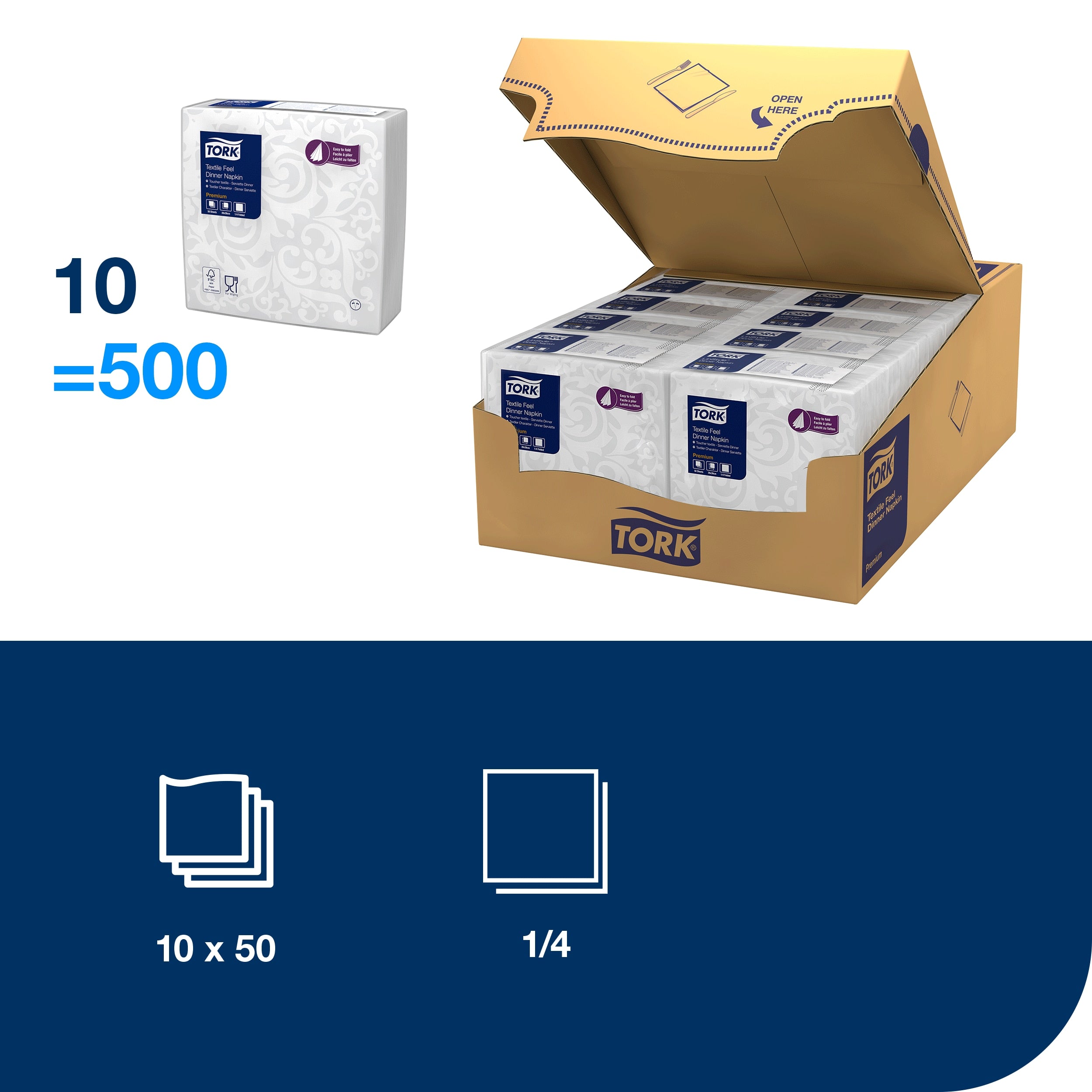 Schaffen Sie mit unseren weißen Tork Dinnerservietten ein hochwertiges Dinner-Erlebnis – ohne übermäßige Kosten. In Restaurants mit Bedienung am Tisch werden Ihre Gäste die angenehme leinenartige Haptik dieser Servietten schätzen. Zudem sparen Sie dank Einwegdesign Zeit und Wäschereikosten. Steigern Sie die Produktivität des Personals beim Eindecken der Tische dank dieser leicht faltbaren Vlies-Servietten. Sie sind so robust, dass während des gesamten Abendessens halten – so werden weniger Servietten verbraucht.