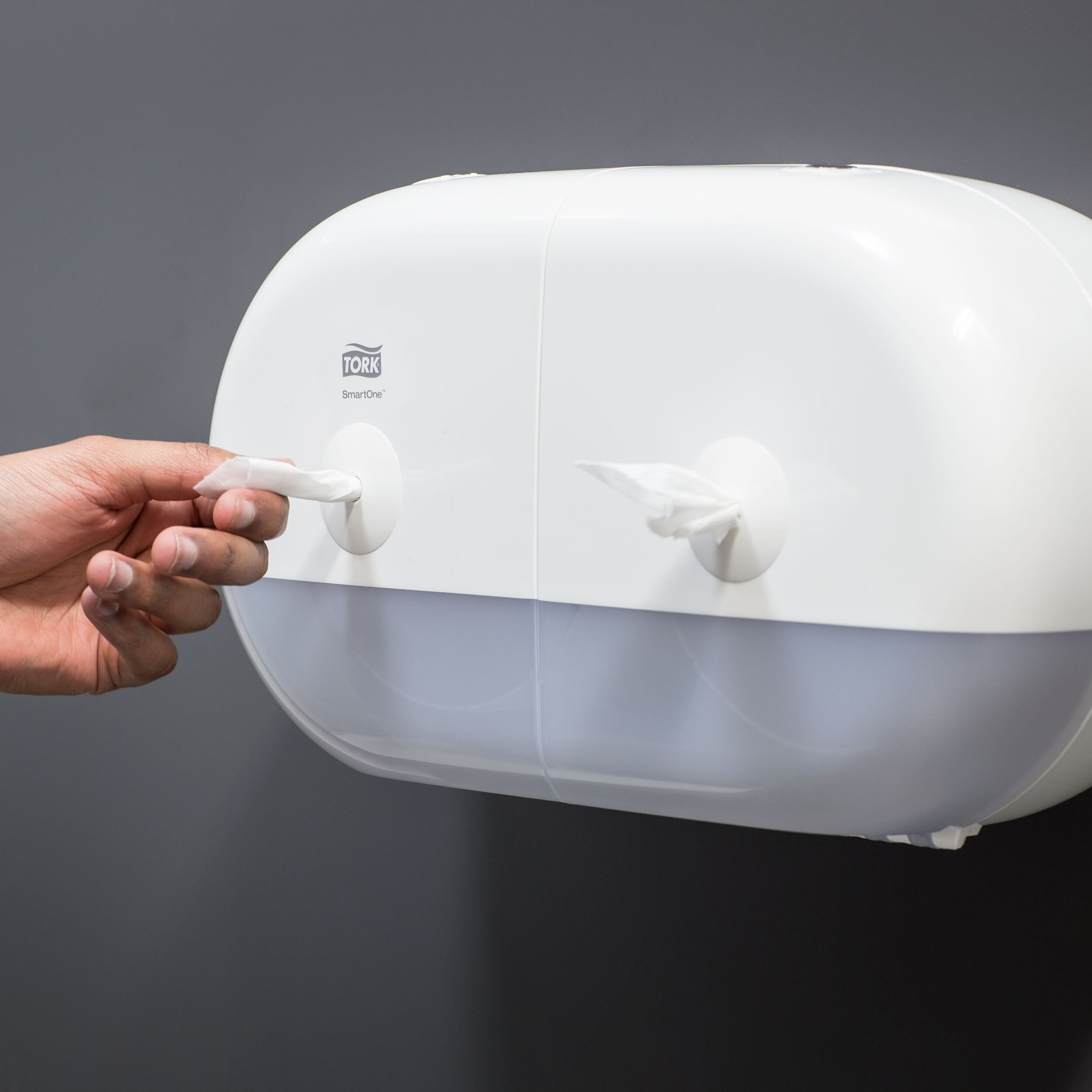 In viel besuchten Waschräumen sind Papierengpässe und Verschwendung häufig. Der Tork SmartOne® Mini Spender für zwei vollkommen aufbrauchbare Rollen reduziert Abfall und Kontrollen. Dank Einzeltuchentnahme entstehen weniger Kosten als mit herkömmlichen Jumbo Spendern: Gäste verbrauchen bis zu 40 % weniger, die Rolle hält länger. Zudem berühren sie nur entnommenes WC-Papier – für mehr Hygiene. Dieser moderne Spender mit praktischer Sperrfunktion schützt Toilettenpapierrollen in anspruchsvollen Waschräumen. Carbon neutral - hergestellt mit zertifiziertem Strom aus erneuerbarer Elektrizität und kompensiert durch Klimaprojekte.