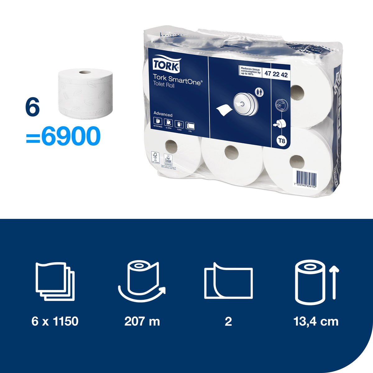 Senken Sie den Papierverbrauch im Waschraum mit Tork SmartOne® Toilettenpapierrollen zur hygienischen Einzelblattentnahme. Die Rolle mit hoher Kapazität passt in viele SmartOne® Spender für anspruchsvolle, viel besuchte Waschräume. Das Ausgabesystem senkt den Verbrauch um bis zu 40 % verglichen mit Jumbo Spendern: Die Rolle hält länger und weniger Kontrollen sind nötig. Zudem vermeiden Sie Rohrverstopfung mit rasch zersetzbarem WC-Papier und profitieren von der praktischen Verpackung mit der Torl Easy Handling® Tragetasche.