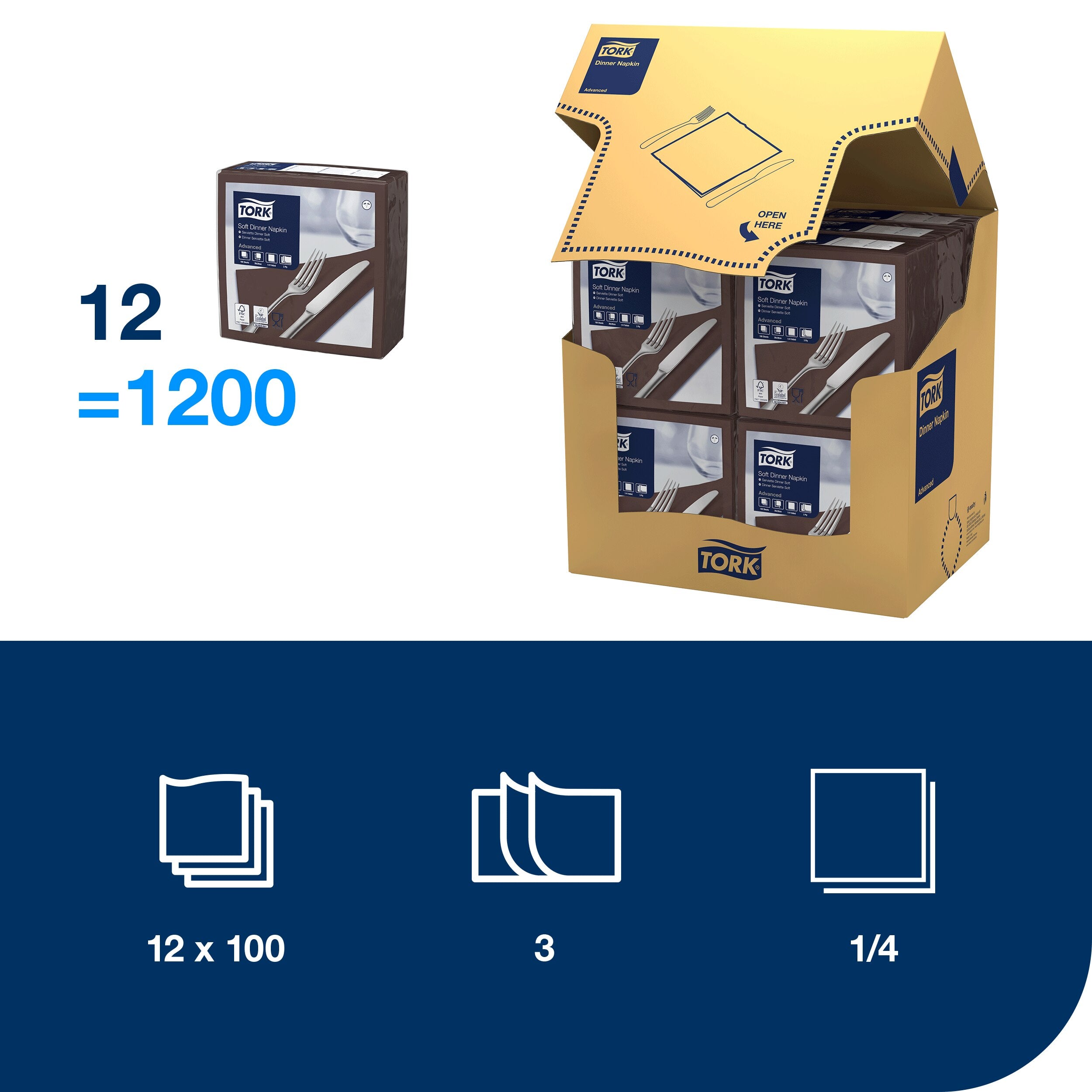 Bereichern Sie die Atmosphäre Ihres Restaurants mit unseren Tork Soft Dinnerservietten. Dank des größeren Formats bieten diese Servietten mehr Komfort. Die Qualität des Materials und die Stärke dieser 3-lagigen Papierservietten sind deutlich zu fühlen und steigern die Zufriedenheit der Gäste. Ihr Personal braucht weniger Zeit für das Eindecken der Tische, da sich die Servietten leicht falten lassen. Die breite Farbpalette dieser Servietten hilft Ihnen dabei, einen Farbton zu finden, der zur Einrichtung Ihres Restaurants passt.