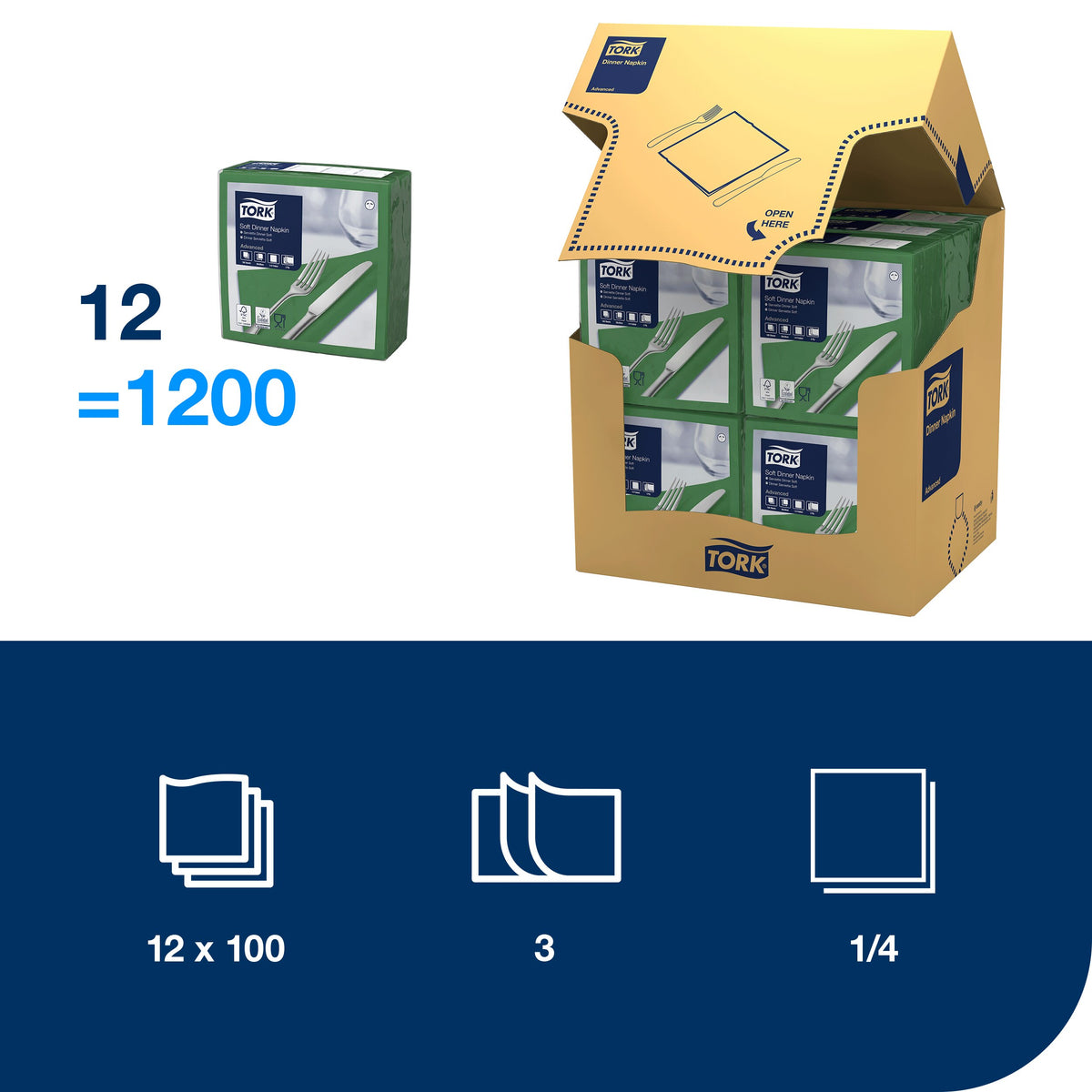 Bereichern Sie die Atmosphäre Ihres Restaurants mit unseren Tork Soft Dinnerservietten. Dank des größeren Formats bieten diese Servietten mehr Komfort. Die Qualität des Materials und die Stärke dieser 3-lagigen Papierservietten sind deutlich zu fühlen und steigern die Zufriedenheit der Gäste. Ihr Personal braucht weniger Zeit für das Eindecken der Tische, da sich die Servietten leicht falten lassen. Die breite Farbpalette dieser Servietten hilft Ihnen dabei, einen Farbton zu finden, der zur Einrichtung Ihres Restaurants passt.