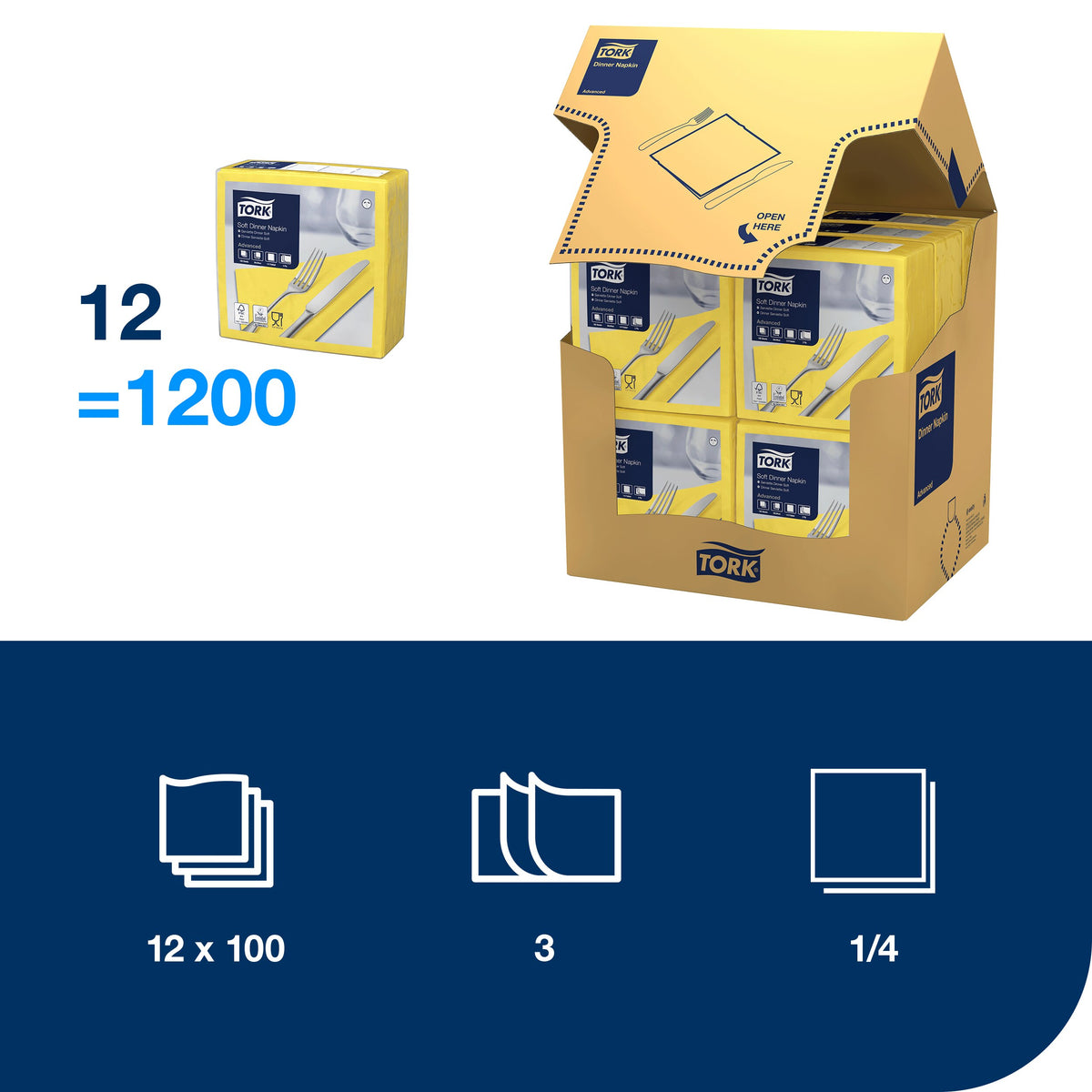 Bereichern Sie die Atmosphäre Ihres Restaurants mit unseren Tork Soft Dinnerservietten. Dank des größeren Formats bieten diese Servietten mehr Komfort. Die Qualität des Materials und die Stärke dieser 3-lagigen Papierservietten sind deutlich zu fühlen und steigern die Zufriedenheit der Gäste. Ihr Personal braucht weniger Zeit für das Eindecken der Tische, da sich die Servietten leicht falten lassen. Die breite Farbpalette dieser Servietten hilft Ihnen dabei, einen Farbton zu finden, der zur Einrichtung Ihres Restaurants passt.