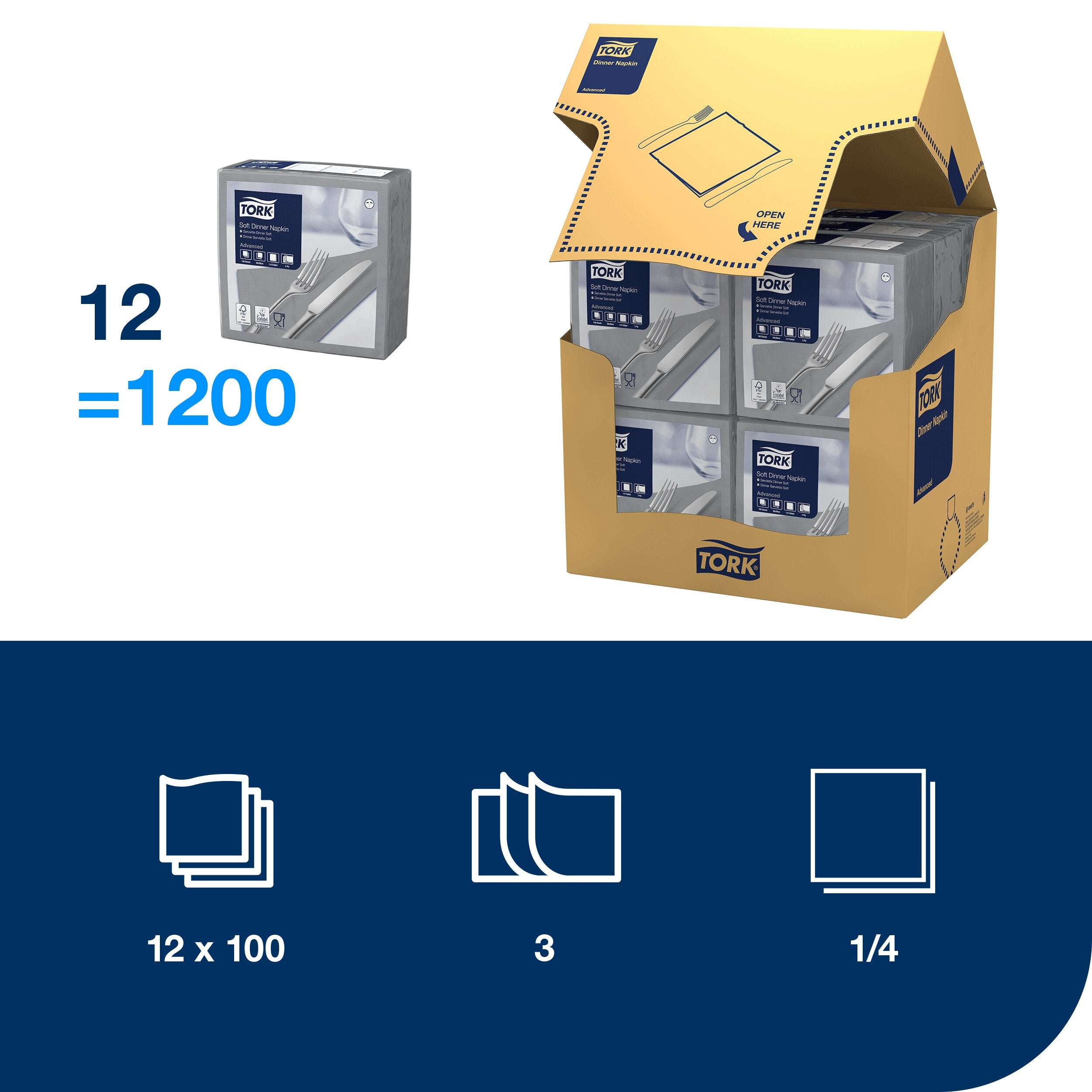 Bereichern Sie die Atmosphäre Ihres Restaurants mit unseren Tork Soft Dinnerservietten. Dank des größeren Formats bieten diese Servietten mehr Komfort. Die Qualität des Materials und die Stärke dieser 3-lagigen Papierservietten sind deutlich zu fühlen und steigern die Zufriedenheit der Gäste. Ihr Personal braucht weniger Zeit für das Eindecken der Tische, da sich die Servietten leicht falten lassen. Die breite Farbpalette dieser Servietten hilft Ihnen dabei, einen Farbton zu finden, der zur Einrichtung Ihres Restaurants passt.