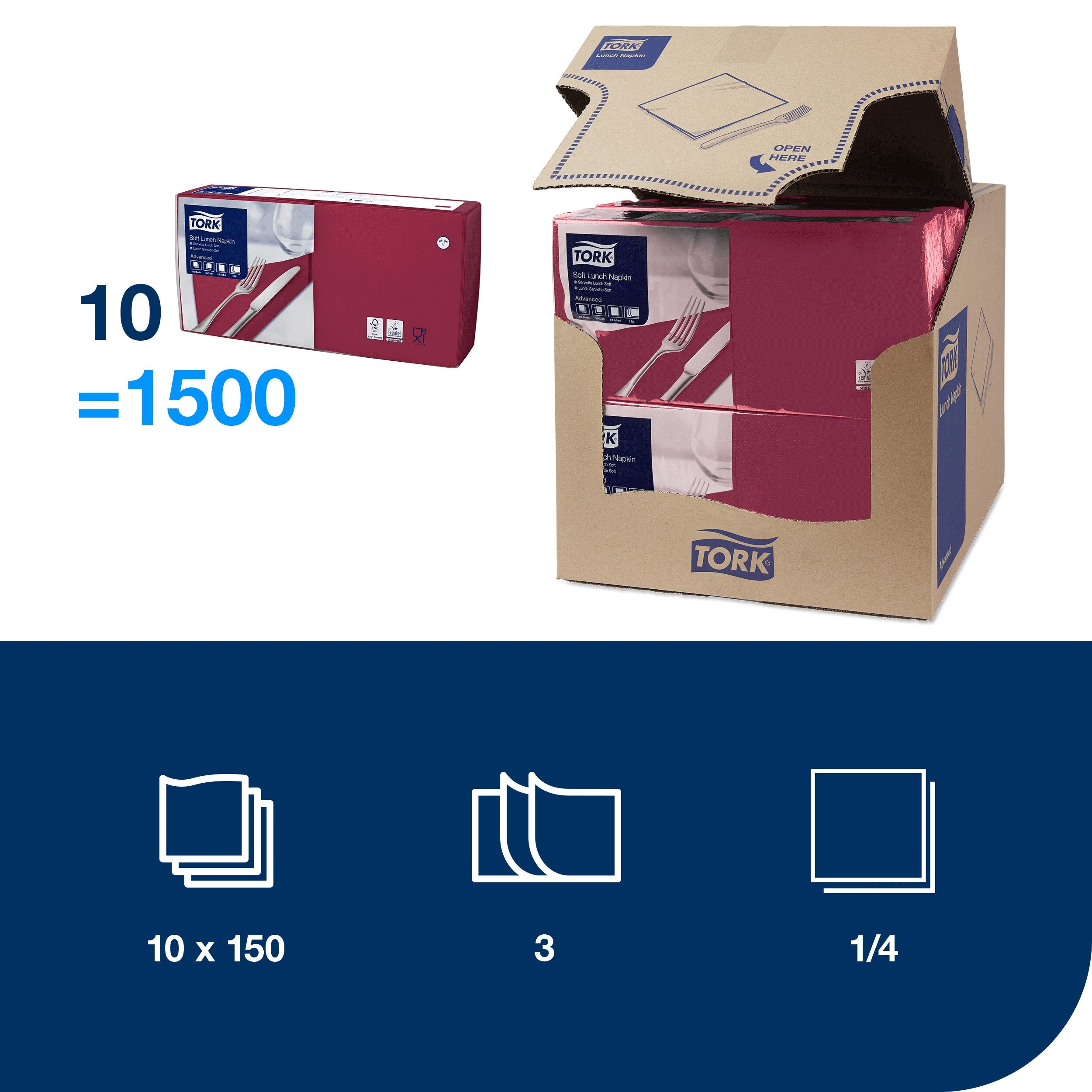 Wischen Sie verschüttete Flüssigkeiten einfach auf dank der hohen Saugfähigkeit unserer 3-lagigen, soften Tork Lunchservietten. Sie haben die perfekte Größe für kleine Mahlzeiten oder Snacks und bieten ein hervorragendes Preis-Leistungs-Verhältnis. Mit der hochwertigen, voluminösen Machart der Servietten begeistern Sie Ihre Gäste zur Mittagszeit. Dank unserer großen Auswahl an modernen und klassischen Farbtönen finden Sie problemlos die zu Ihrer Einrichtung passenden Papierservietten.