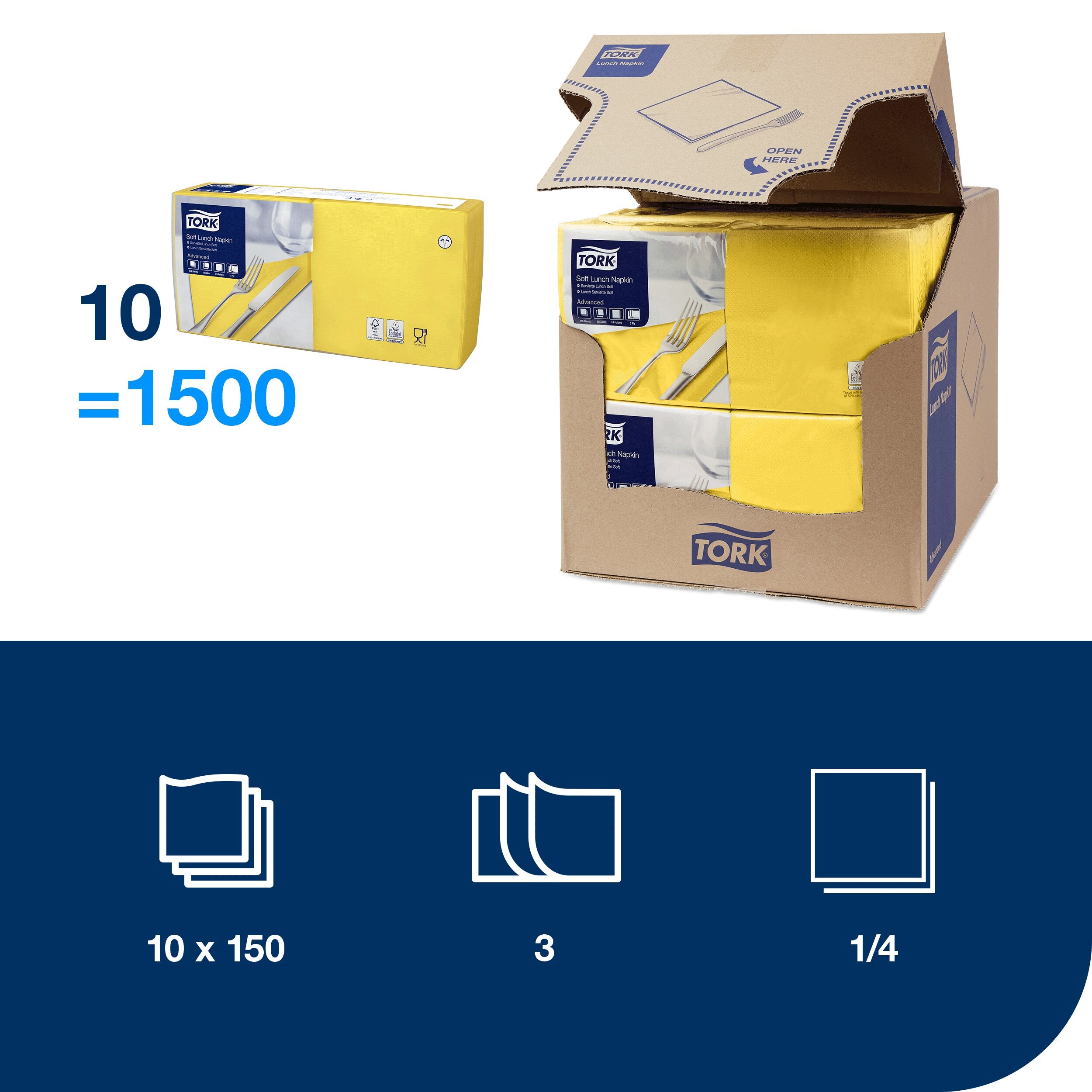 Wischen Sie verschüttete Flüssigkeiten einfach auf dank der hohen Saugfähigkeit unserer 3-lagigen, soften Tork Lunchservietten. Sie haben die perfekte Größe für kleine Mahlzeiten oder Snacks und bieten ein hervorragendes Preis-Leistungs-Verhältnis. Mit der hochwertigen, voluminösen Machart der Servietten begeistern Sie Ihre Gäste zur Mittagszeit. Dank unserer großen Auswahl an modernen und klassischen Farbtönen finden Sie problemlos die zu Ihrer Einrichtung passenden Papierservietten.