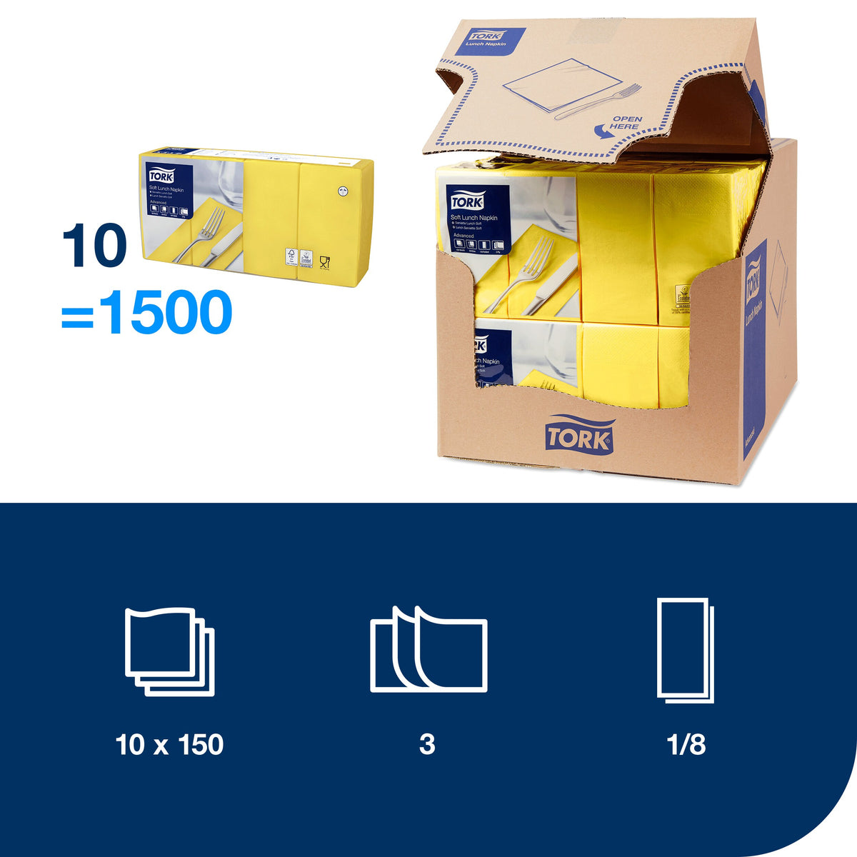 Mit unseren soften Tork Lunchservietten genießen Ihre Gäste die Mahlzeit noch mehr. Dank des sehr saugfähigen 3-lagigen Designs können Sie schnell verschüttete Flüssigkeiten aufwischen. Die praktische Größe ist ideal für kleine Mahlzeiten oder Snacks und bietet ein hervorragendes Preis-Leistungs-Verhältnis. Die Papierservietten sind vorgefaltet, was Ihren Mitarbeitern wertvolle Zeit beim Eindecken spart. In unserer großen Auswahl an modernen und klassischen Farben finden Sie den passenden Ton für Ihre Einrichtung.