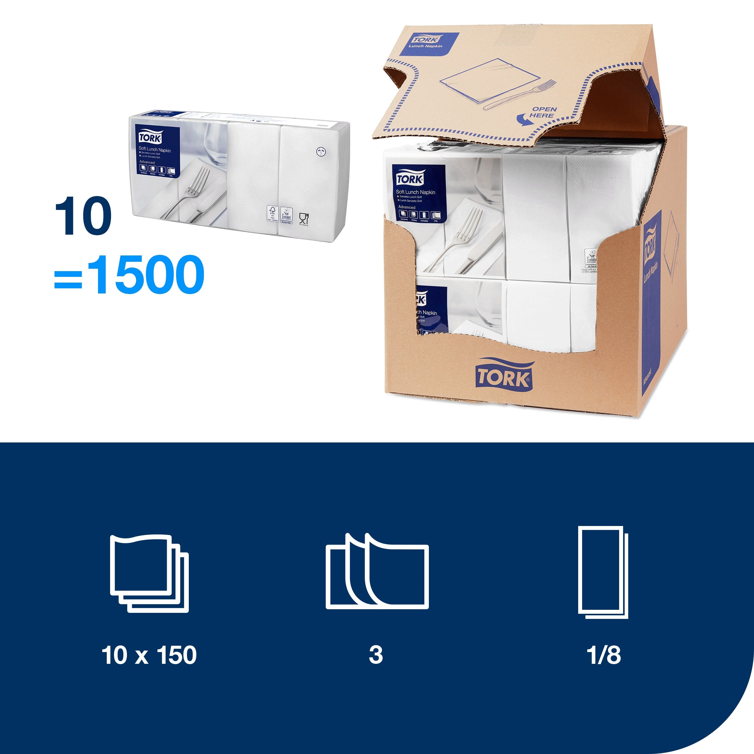 Mit unseren soften Tork Lunchservietten genießen Ihre Gäste die Mahlzeit noch mehr. Dank des sehr saugfähigen 3-lagigen Designs können Sie schnell verschüttete Flüssigkeiten aufwischen. Die praktische Größe ist ideal für kleine Mahlzeiten oder Snacks und bietet ein hervorragendes Preis-Leistungs-Verhältnis. Die Papierservietten sind vorgefaltet, was Ihren Mitarbeitern wertvolle Zeit beim Eindecken spart. In unserer großen Auswahl an modernen und klassischen Farben finden Sie den passenden Ton für Ihre Einrichtung.