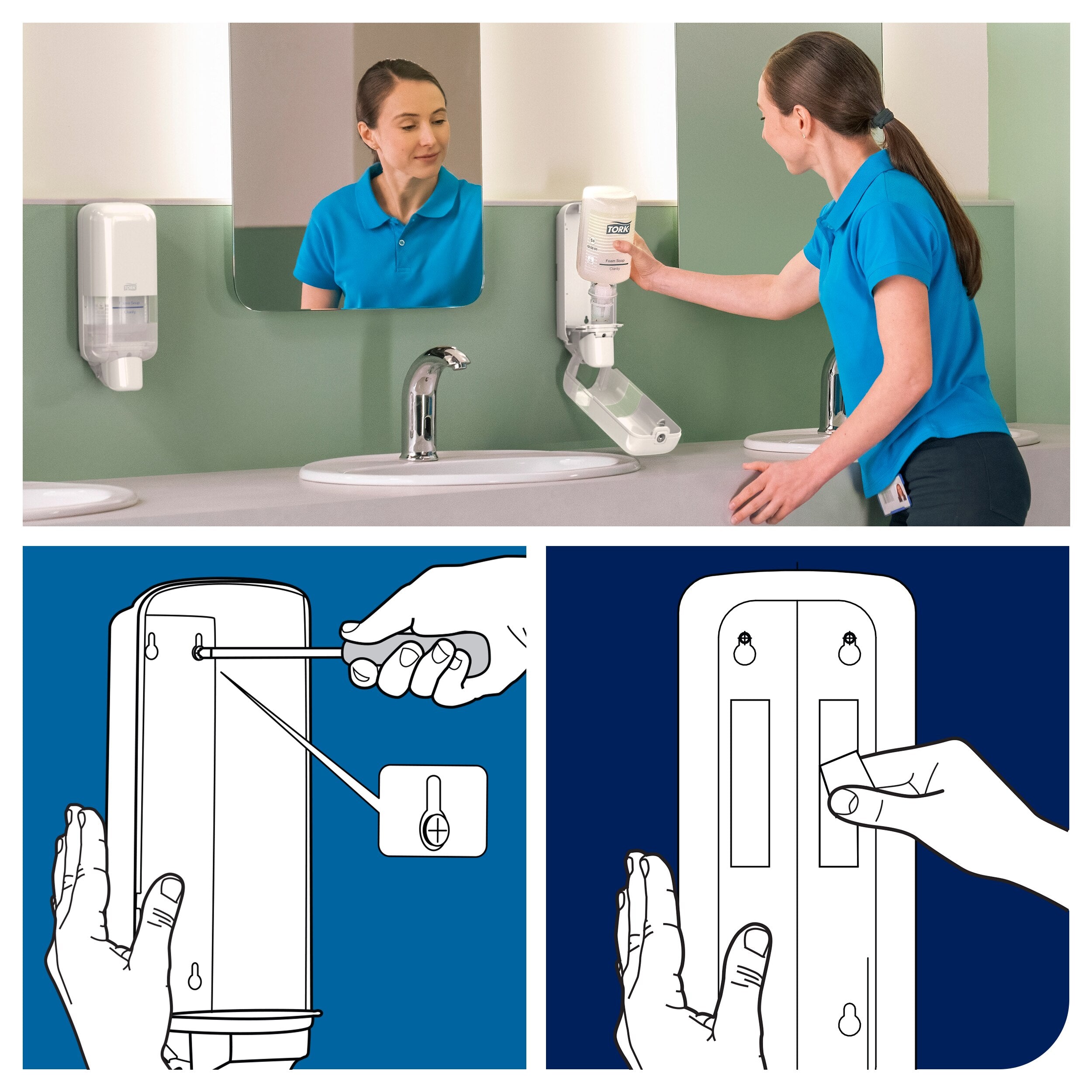 + Bedient bis zu 1.650 Gäste (basierend auf Tork Schaumseife und 0,4 ml je Dosis bei 1,5 Entnahmen pro Gast)
