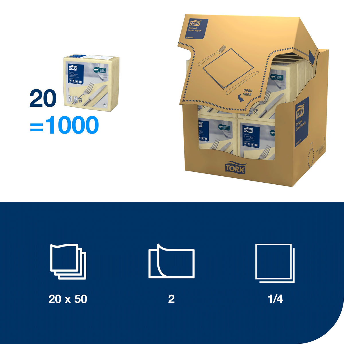 Sparen Sie Geld mithilfe unserer Tork Textured Dinnerservietten – diese Servietten haben die ideale Größe, damit Ihre Gäste sie während des gesamten Abendessens verwenden können und dadurch weniger Servietten verbrauchen. Durch eine spezielle Prägung fühlen sich die Papierservietten dicker und weicher an, was zu höherem Komfort und längerer Nutzung führt. Außerdem sind sie besonders saugfähig, so kann Ihr Personal verschüttete Flüssigkeiten schnell aufwischen. Sie können passend zur Einrichtung Ihres Restaurants aus einer breiten Palette moderner und klassischer Farben wählen.