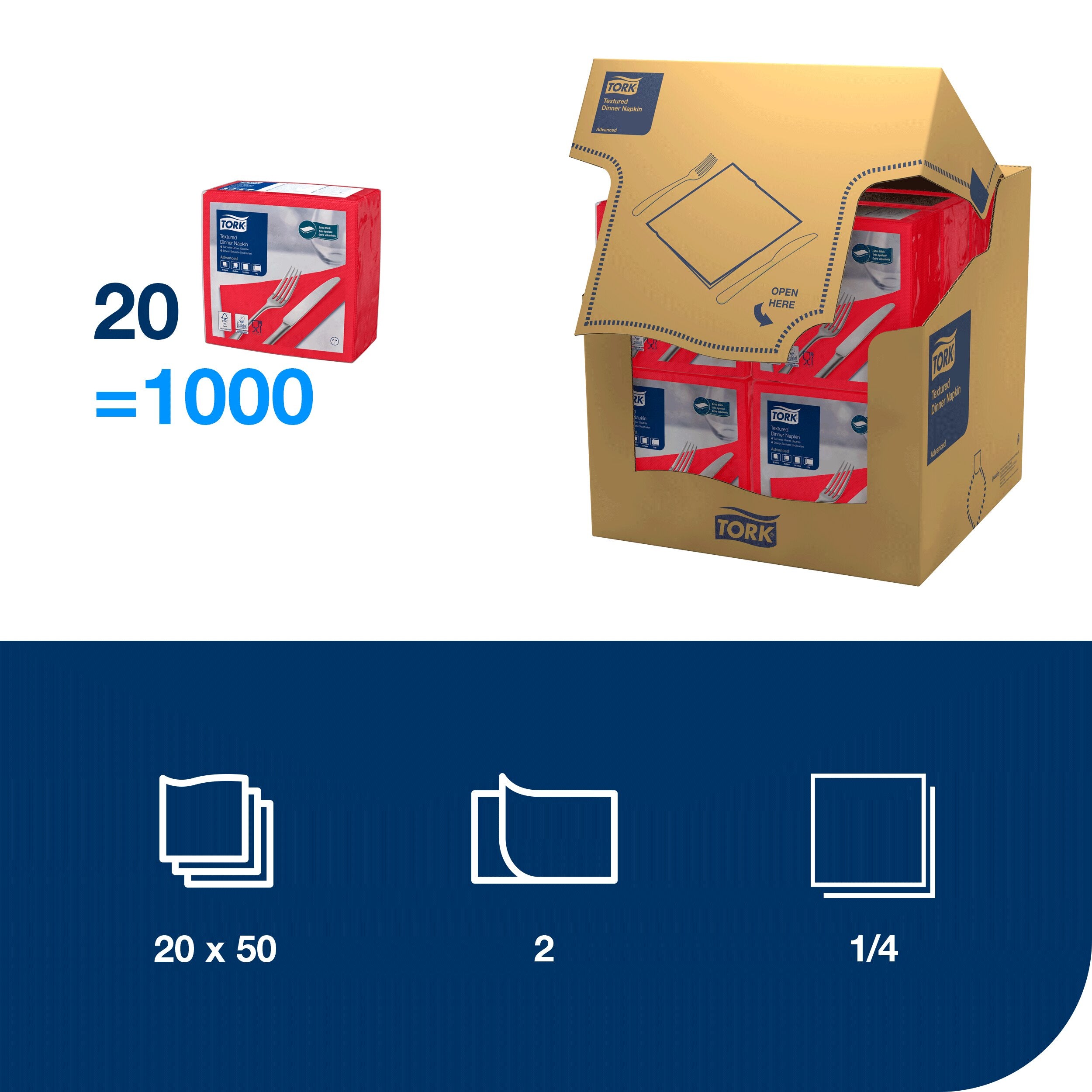 Sparen Sie Geld mithilfe unserer Tork Textured Dinnerservietten – diese Servietten haben die ideale Größe, damit Ihre Gäste sie während des gesamten Abendessens verwenden können und dadurch weniger Servietten verbrauchen. Durch eine spezielle Prägung fühlen sich die Papierservietten dicker und weicher an, was zu höherem Komfort und längerer Nutzung führt. Außerdem sind sie besonders saugfähig, so kann Ihr Personal verschüttete Flüssigkeiten schnell aufwischen. Sie können passend zur Einrichtung Ihres Restaurants aus einer breiten Palette moderner und klassischer Farben wählen.