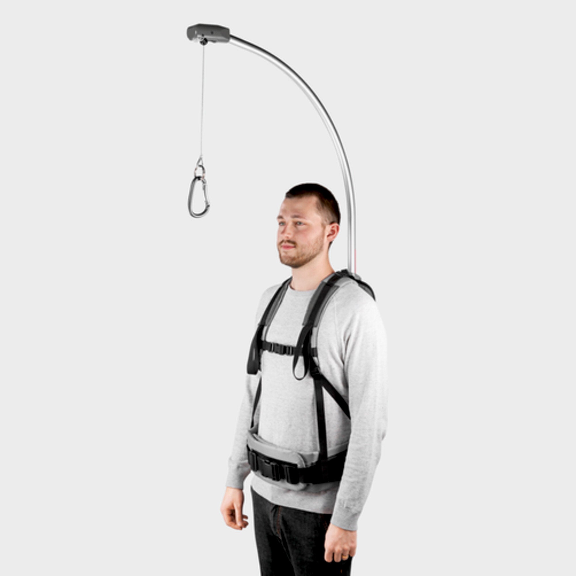 Ermüdungsfrei arbeiten, Produktivität steigern: Das universell einsetzbare Tragegestell besteht aus einem bequem auf dem Rücken zu tragenden, gepolsterten Gurt mit Federzug und einem Karabinerhaken zum Befestigen von Arbeitsgeräten. Das Tragesystem überträgt dabei das Gewicht von Teleskopstangen, Hochdrucklanzen oder Gartengeräten auf den gesamten Rumpf des Bedieners, sodass die benötigte Haltekraft in den Armen nahezu auf null reduziert wird. Der Federzug mit ein- und ausziehbarem Stahlseil sorgt dafür, dass die Kraftübertragung flexibel an die gewünschte Halteposition angepasst wird.