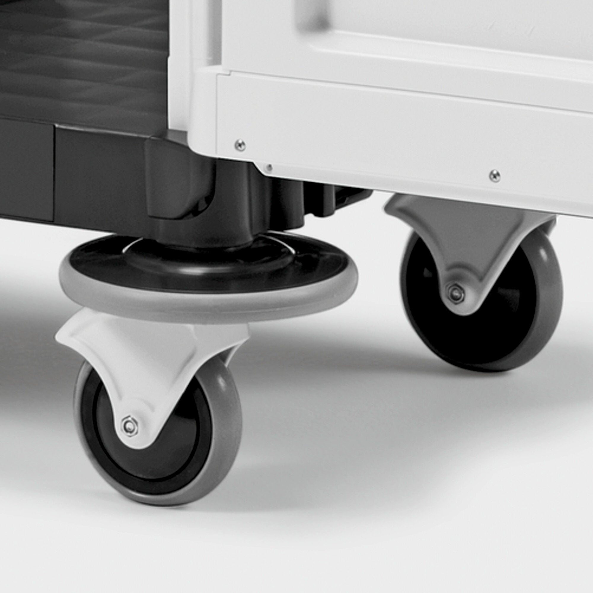 - Einfache ManövrierbarkeitVier drehbare Räder ermöglichen einfaches Manövrieren auf engstem Raum.