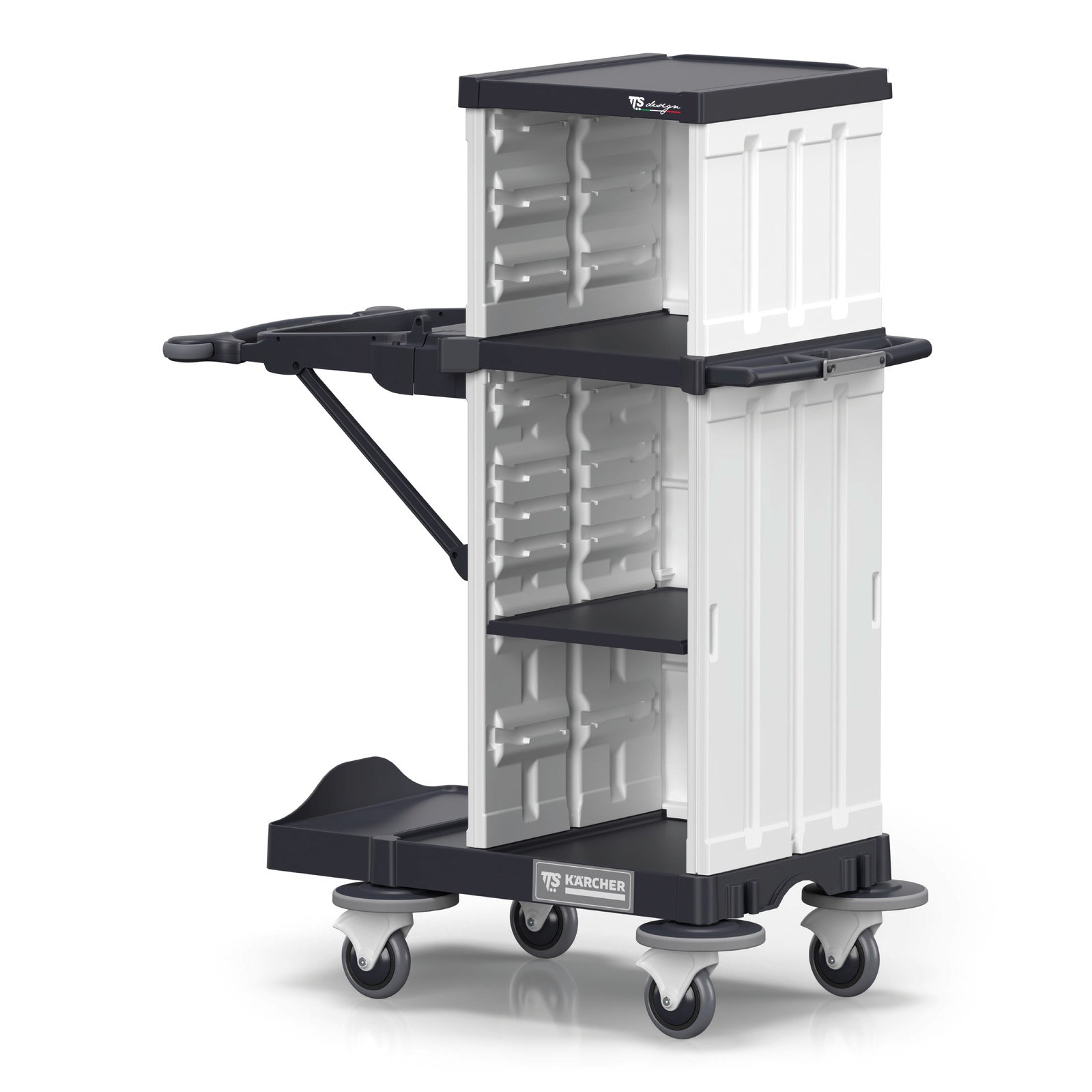 Besonders hochwertig konstruiert und selbst bei hoher Zuladung noch mühelos auf engstem Raum manövrierbar: Der Trolley Hotel Premium I überzeugt mit bester Ergonomie, rostfreien Materialien, robuster Bauweise und langer Lebensdauer. Stoßfest, dank 4 drehbarer, 125 Millimeter großer Räder mit Stoßleisten, und sehr gut ausgestattet ist der Hotelwagen perfekt für die Reinigung und Versorgung von 6 bis 8 Räumen geeignet. Aber auch die Eigenreinigung gestaltet sich durch die durchgängig glatten Oberflächen besonders einfach. Serienmäßig mit dabei ist auch ein 120-Liter-Müllsackhalter.