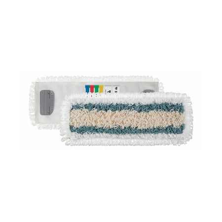 Flachmoppsystem mit Mikro-Laschen, verwendbar mit Rollen-, Backen- oder Vertikalpresse. Ideal für alle Oberflächen und Schmutzarten dank der Kombination der 3 Fasern: Baumwolle für die Wasseraufnahme, Mikrofaser für die Schmutzaufnahme und Polyester für fetthaltige Verschmutzungen und gute Gleitfähigkeit.