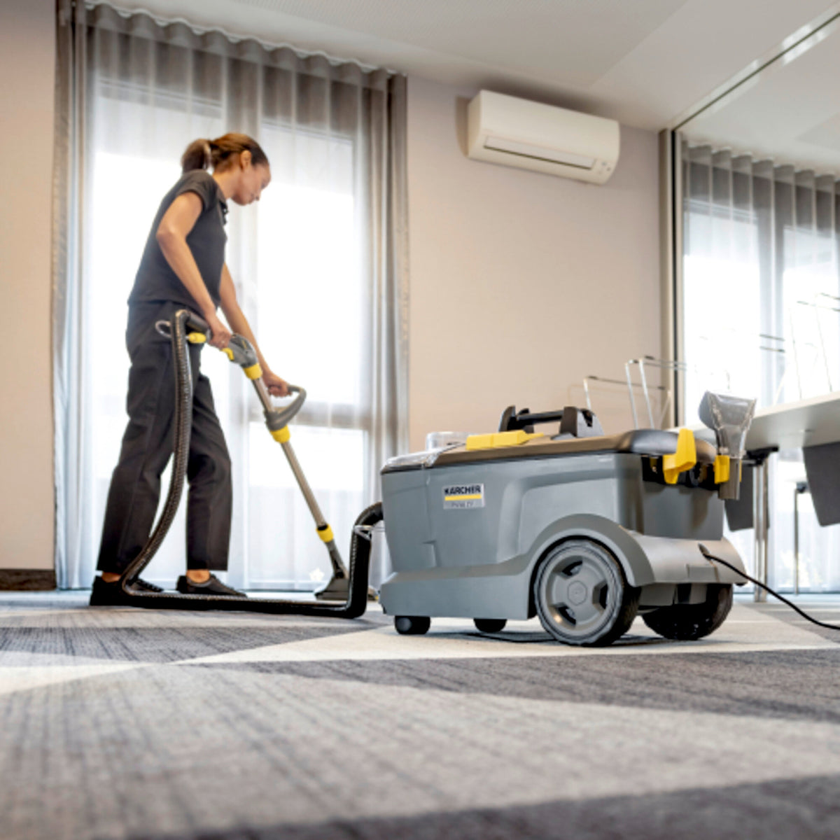 L'injecteur-extracteur professionnel Puzzi 10/1 Edition de Kärcher offre une très bonne puissance d'aspiration et permet d'obtenir d'excellents résultats de nettoyage hygiéniques, ainsi qu'une remise en état rapide des surfaces textiles. À cet effet, l'appareil d'injection-extraction injecte la solution de nettoyage jusqu'au cœur des fibres textiles puis la réaspire en décollant en même temps la saleté : il convient ainsi parfaitement au nettoyage des capitonnages, des tapis/moquettes et autres surfaces textiles. Le format robuste et compact du Puzzi 10/1 Edition garantit une longue durée de vie et donc une rentabilité élevée. Il est idéal pour les entreprises de nettoyage de bâtiments, l'hôtellerie et la restauration ou le nettoyage intérieur des véhicules. Pour mieux voir l'eau sale, le couvercle de l'appareil ainsi que le suceur pour meubles et le suceur pour sol sont transparents. De grands boutons-poussoirs actionnés à la main ou au pied augmentent le confort d'utilisation. Nombreux accessoires inclus dans la livraison : suceur pour tapis/moquette de 240 mm, suceur pour meubles, suceurs pour fentes, et également 48 tablettes RM 760.